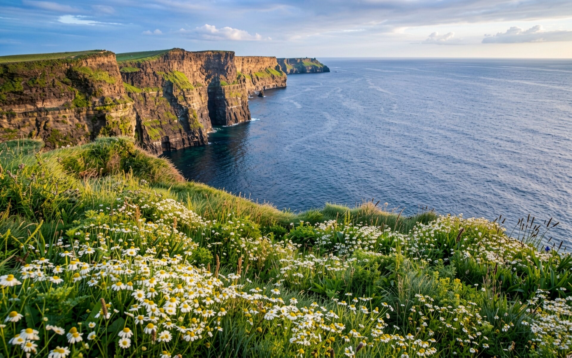 Скалы Мохер зеленые луга белые ромашки
