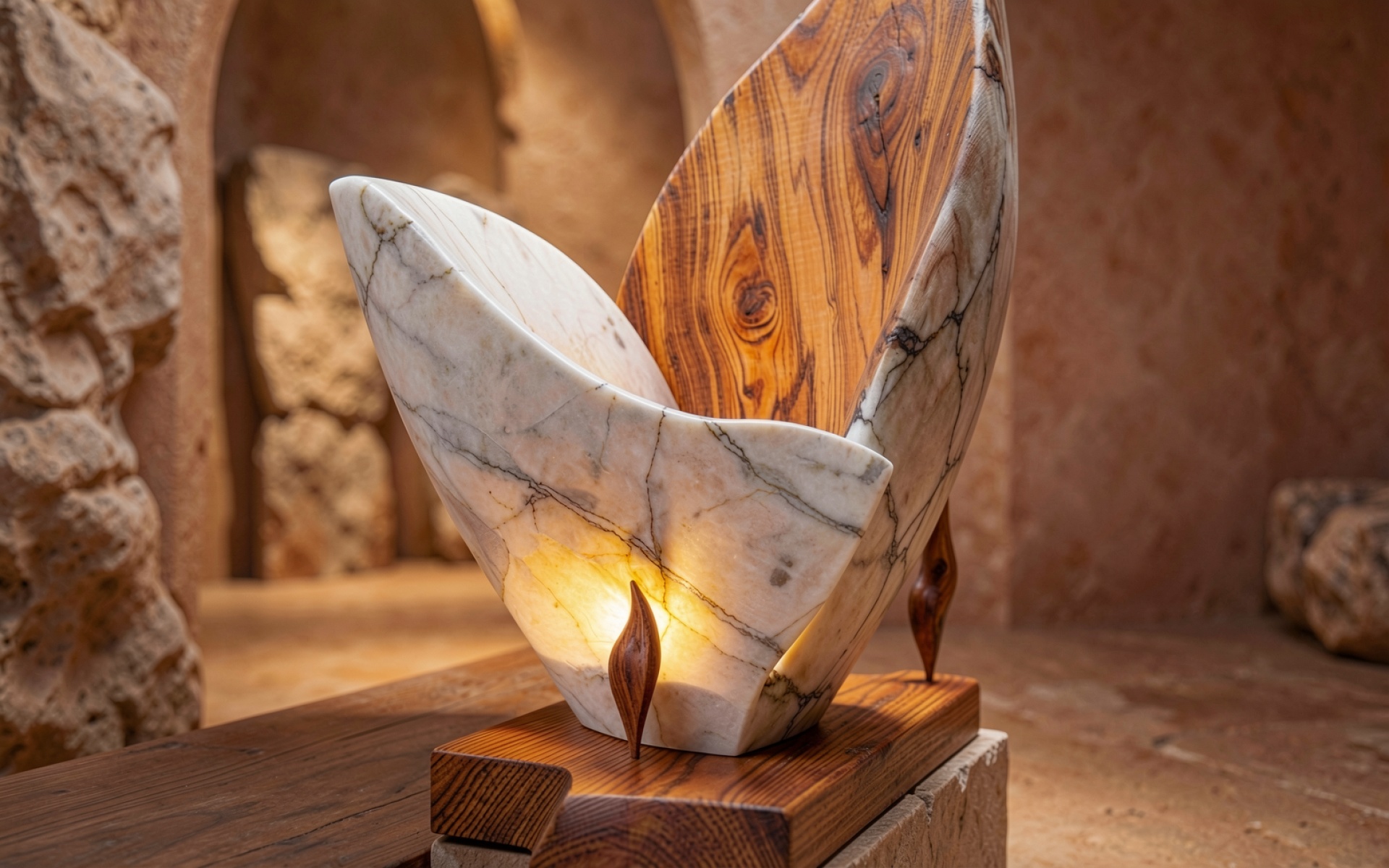 Скульптура из белого мрамора и дерева в интерьере