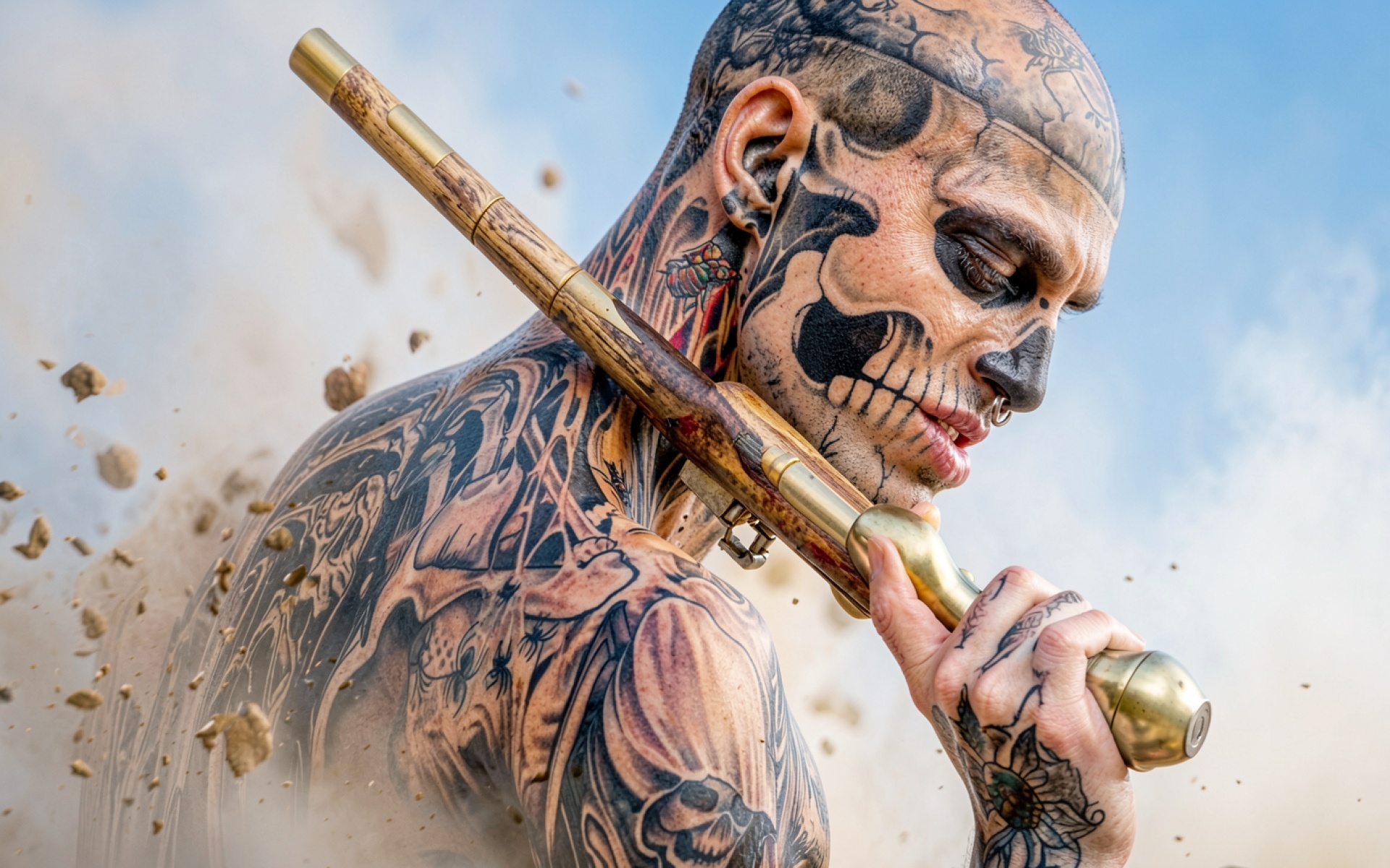 Татуированный мужчина с ружьем в пыльном окружении