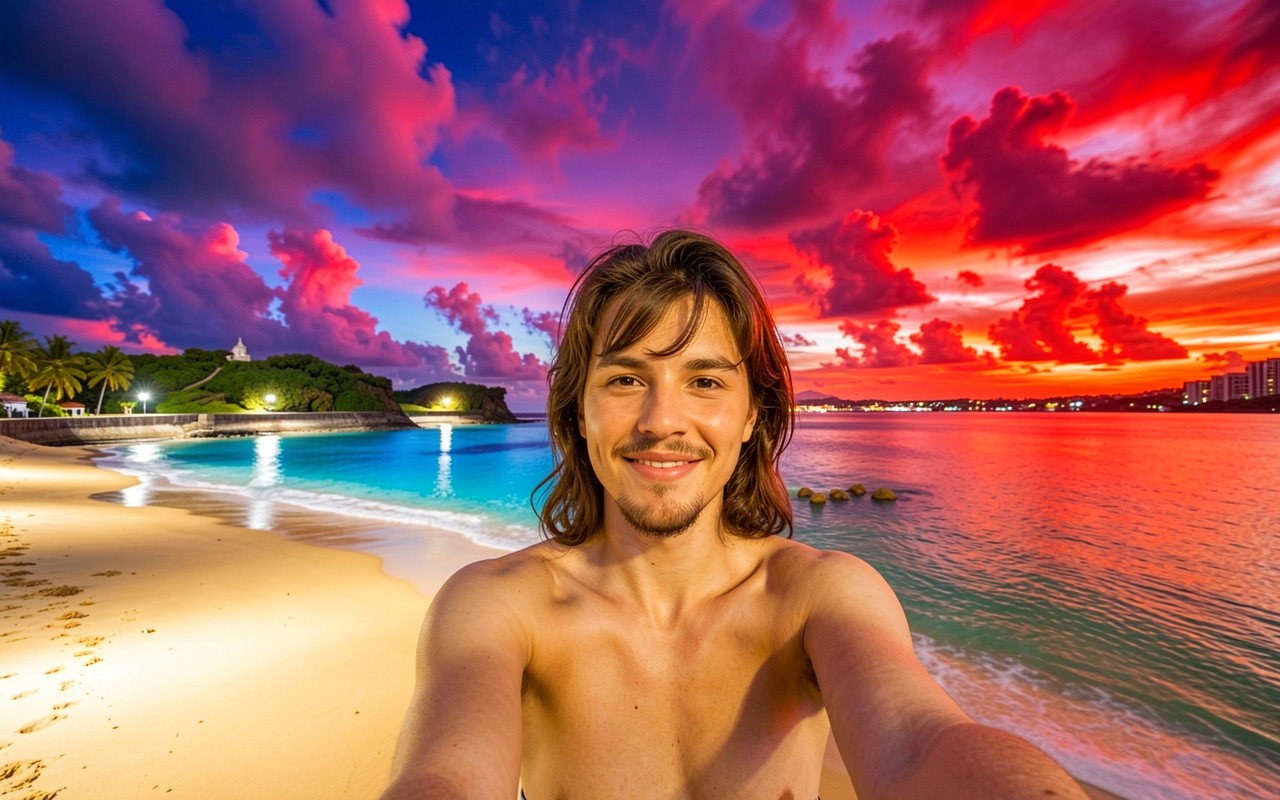 Мужчина с длинными волосами на тропическом пляже
