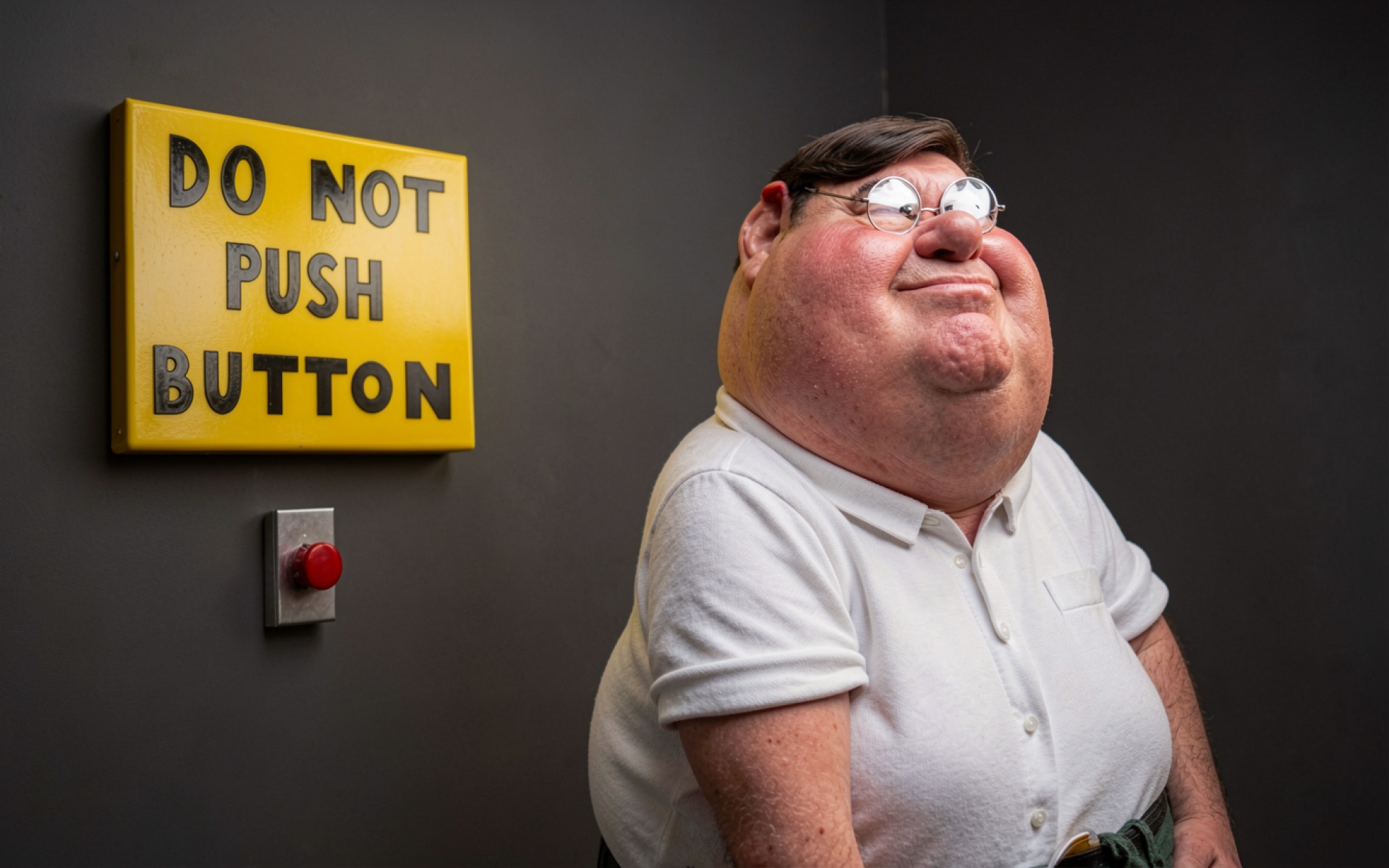 Мужчина в белой рубашке рядом с красной кнопкой