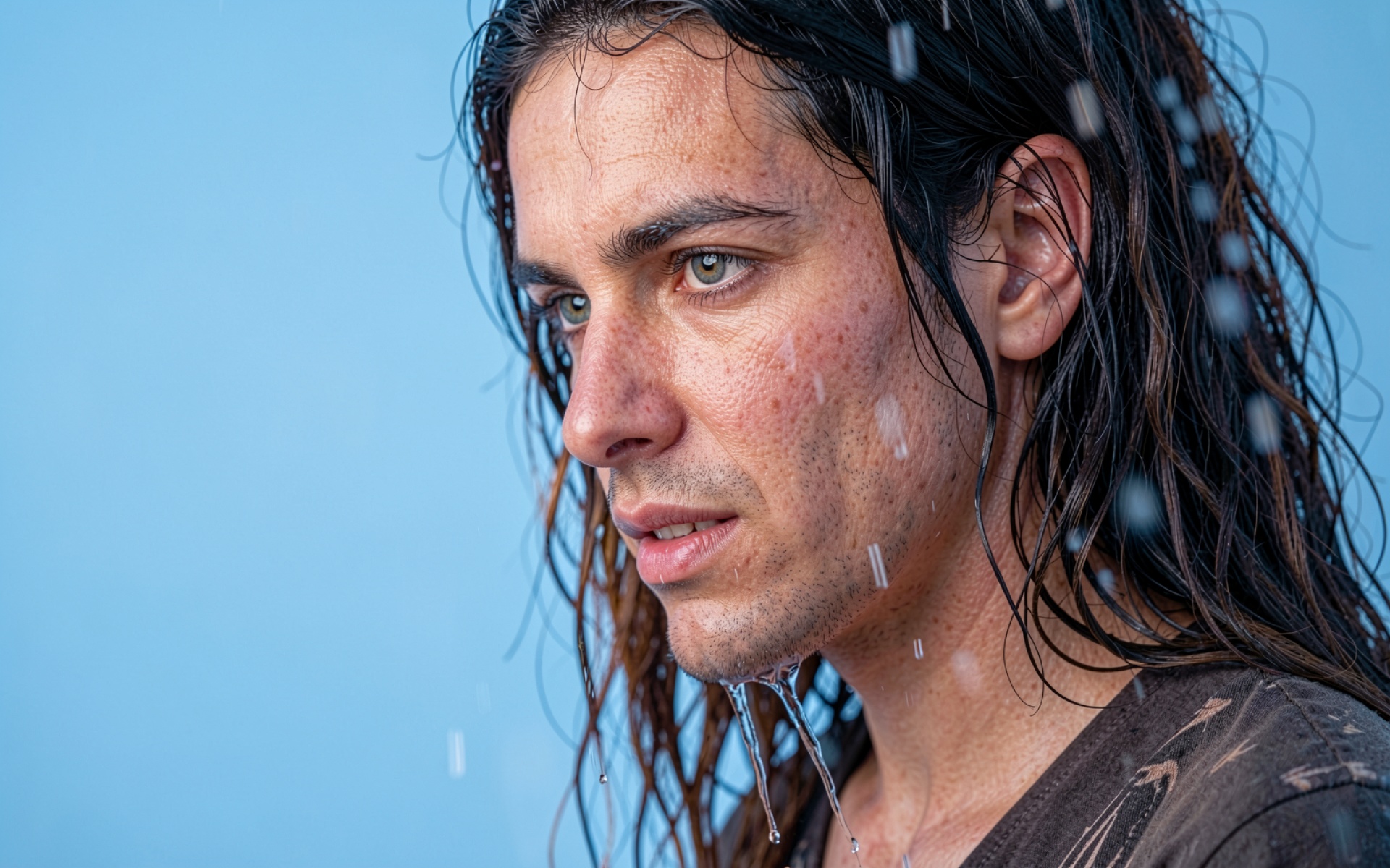 Мужчина с мокрыми волосами голубой фон