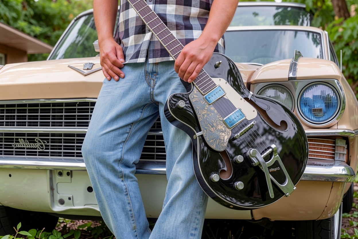 Черная электрогитара с мужчиной на фоне авто