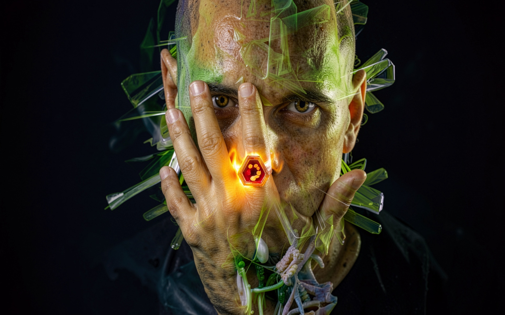 Киберпанк портрет мужчины с зеленым стеклом
