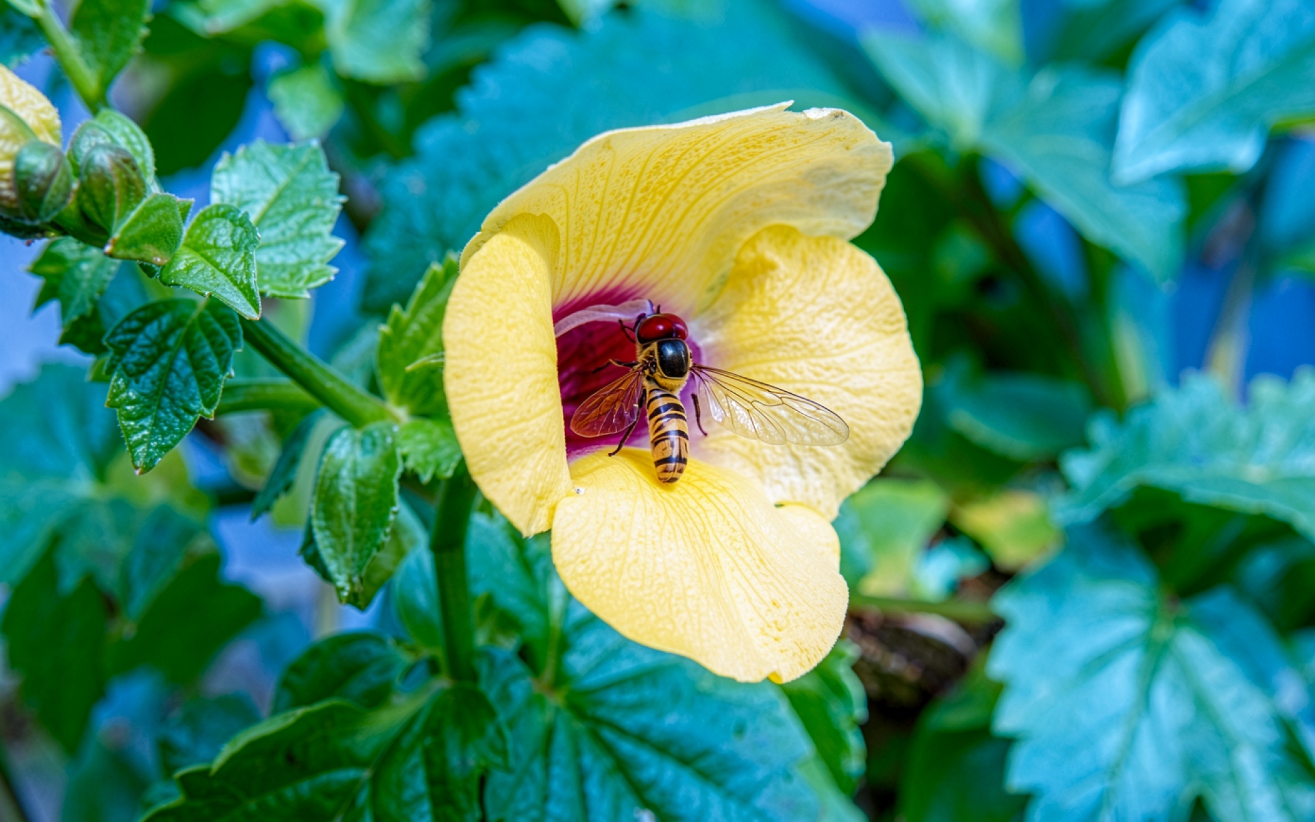 Желтый цветок с полосатой мухой макаром