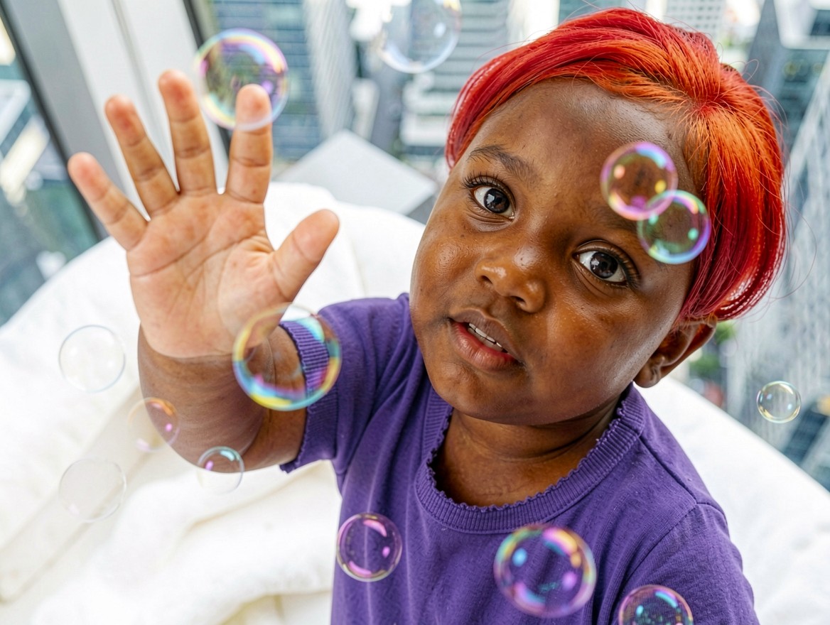 Афроамериканская девочка с красными волосами и мыльными пузырями
