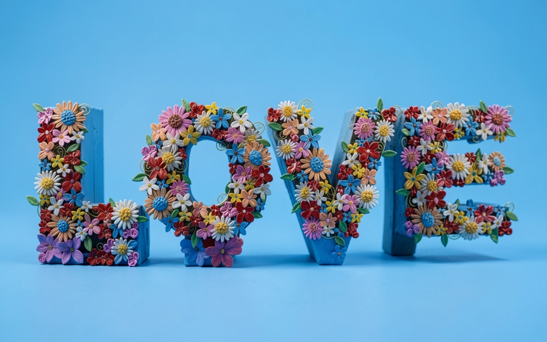 Надпись LOVE из разноцветных цветов на голубом фоне