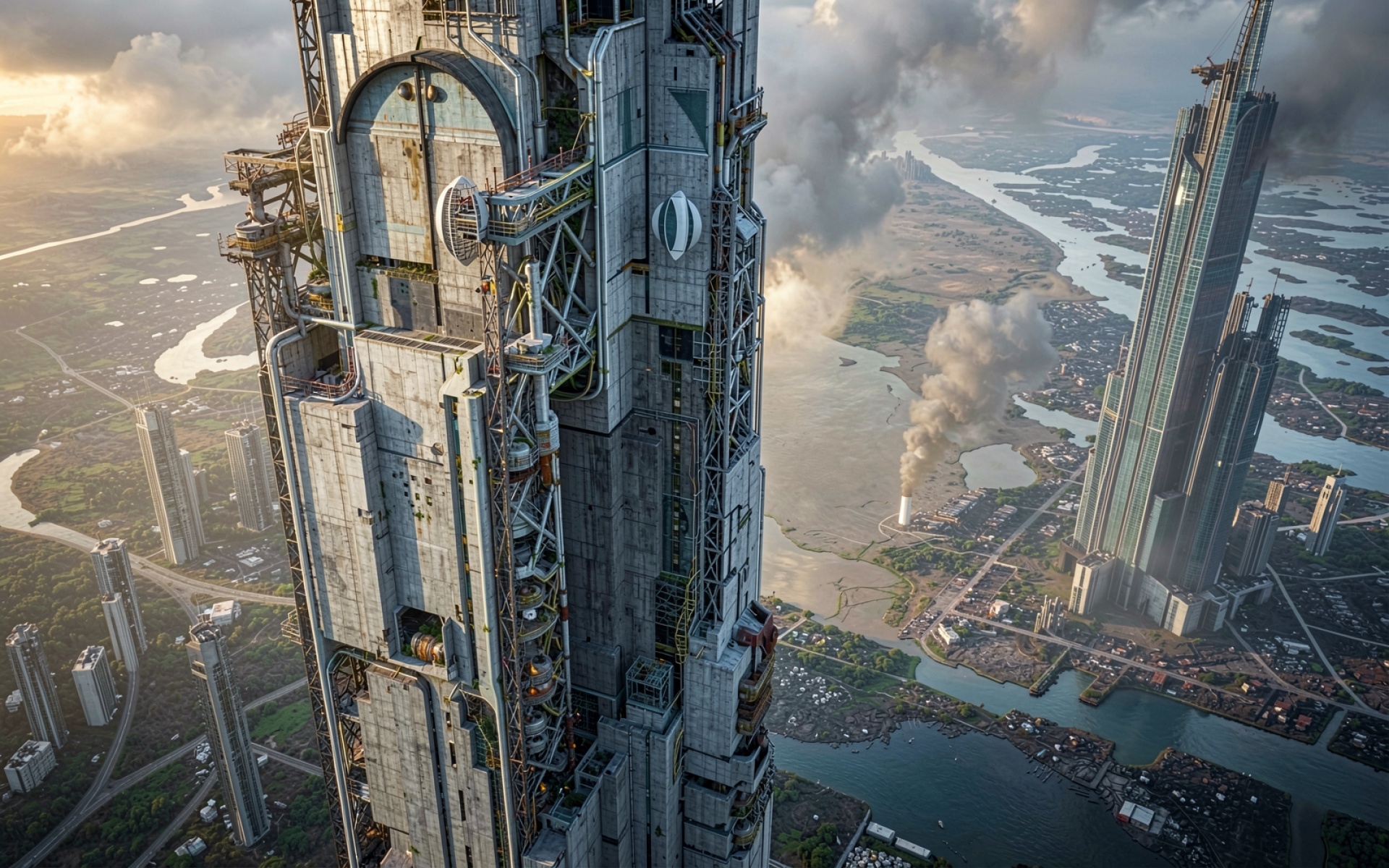 Футуристический небоскреб индустриальный стиль серый бетон
