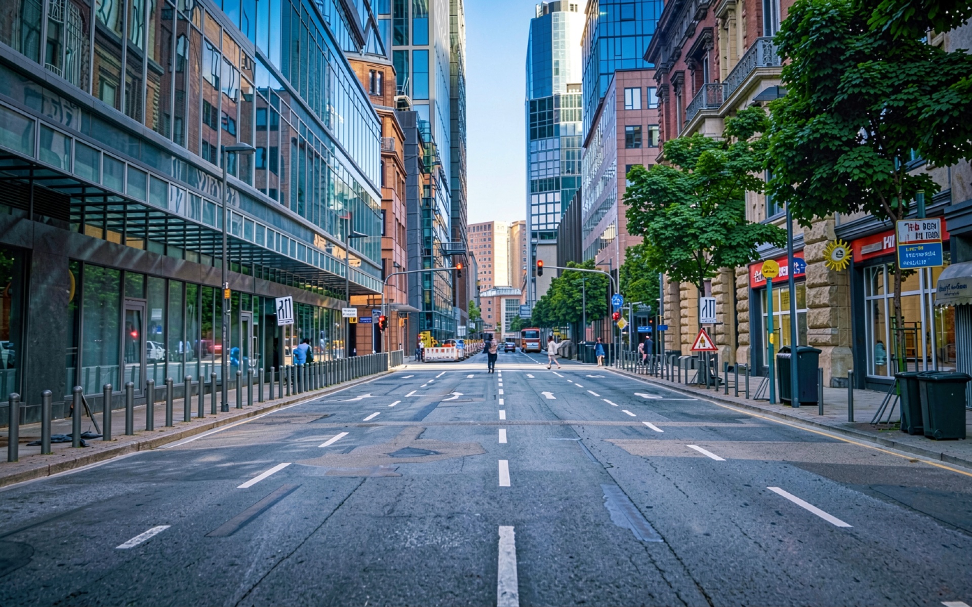 Современная улица города с небоскребами и деревьями