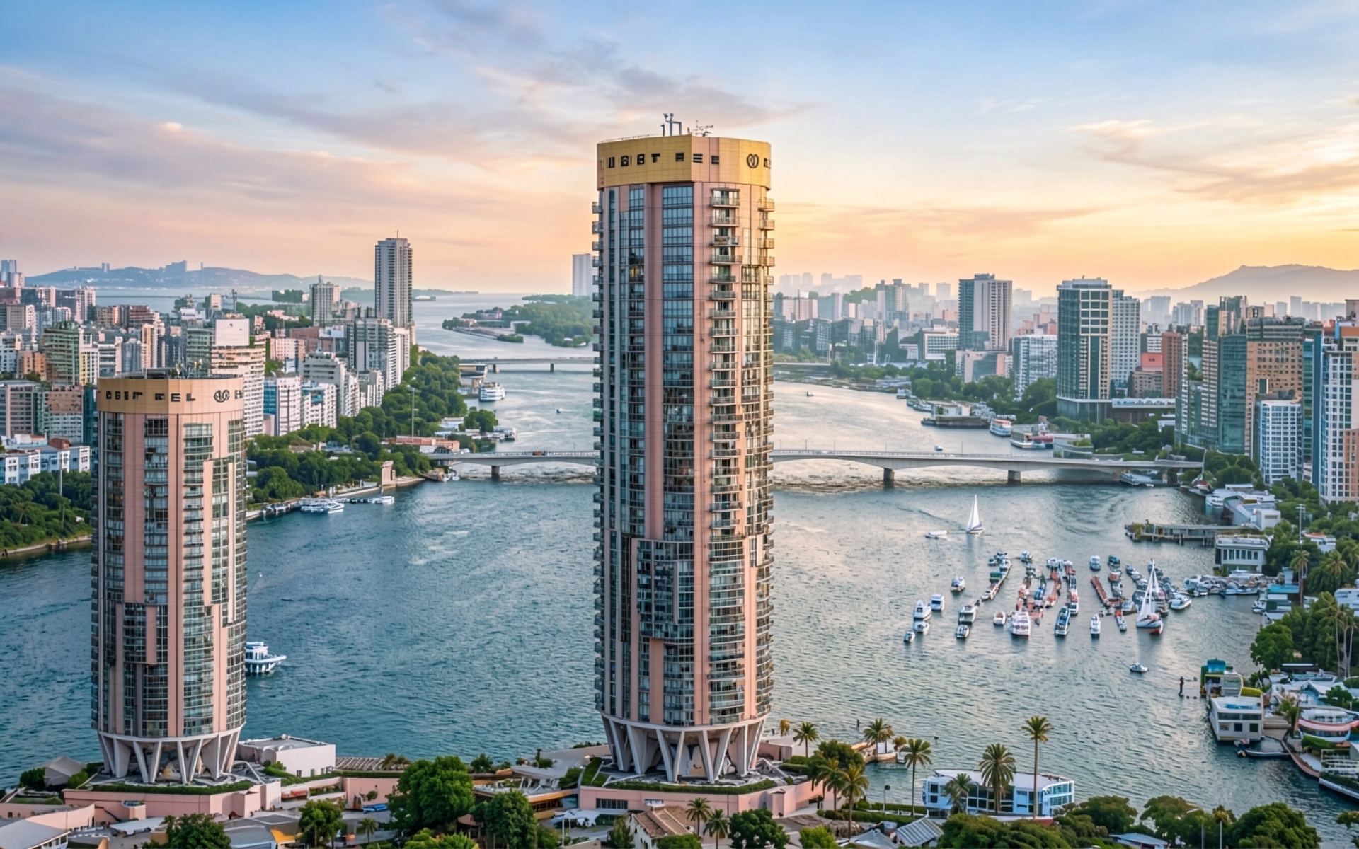Небоскребы в розовых тонах на закате