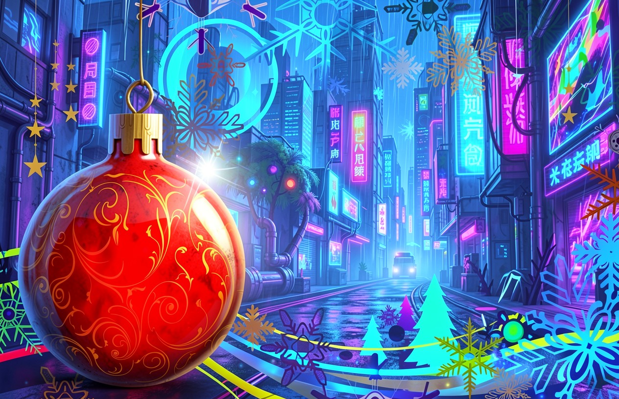 Красный рождественский шар в неоновом киберпанке