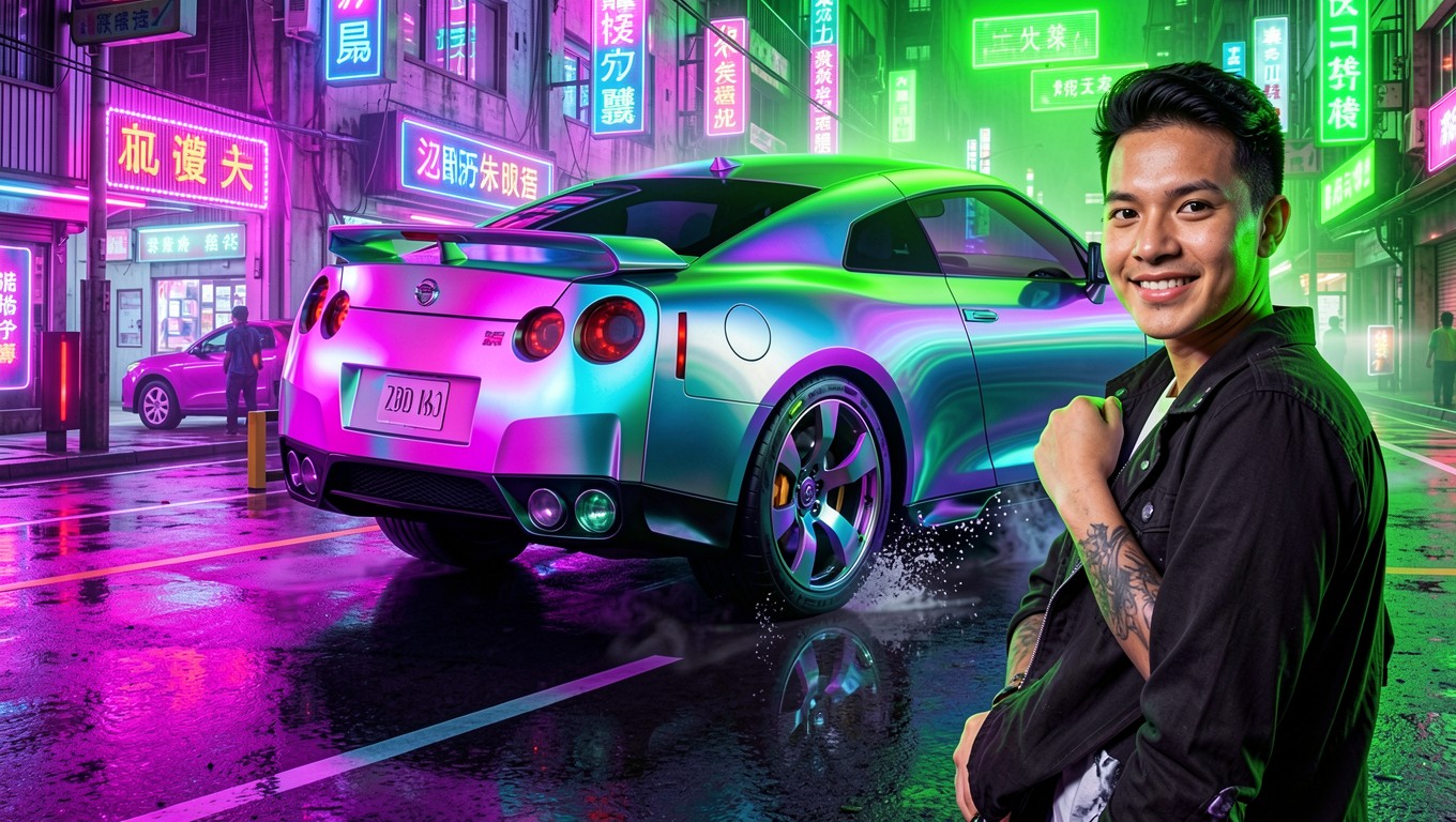 Спортивный автомобиль Nissan GTR неоновый Токио