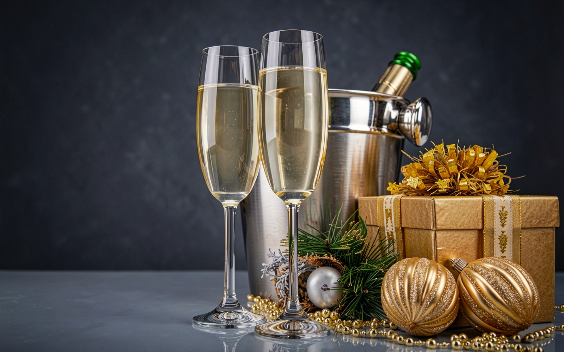 Бокалы с шампанским в золотом новогоднем декоре