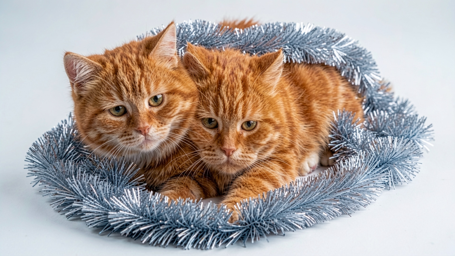 Два рыжих котенка в серебристом новогоднем венке