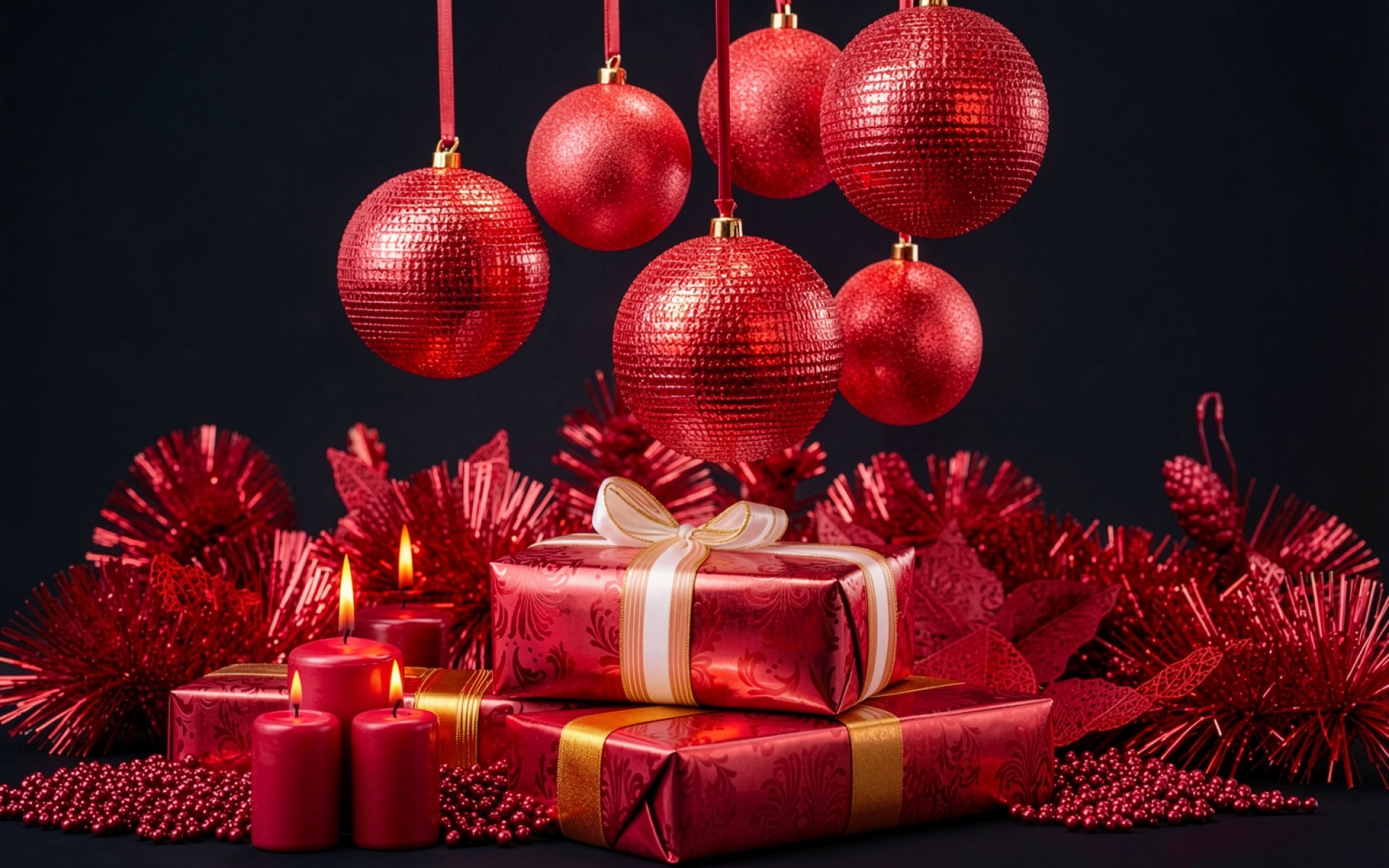 Красные новогодние шары и подарки на черном фоне