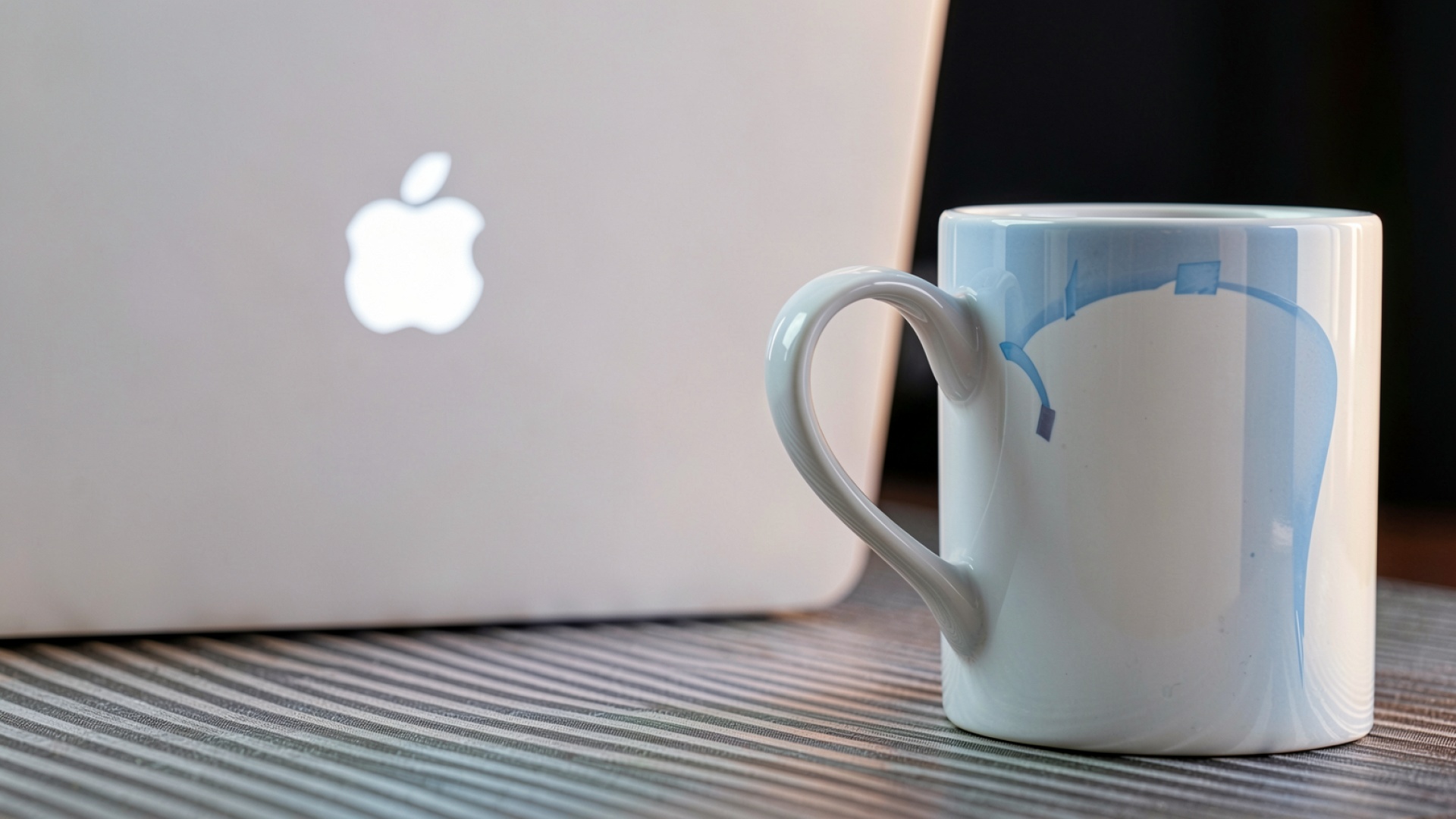 Белая керамическая кружка рядом с ноутбуком Apple