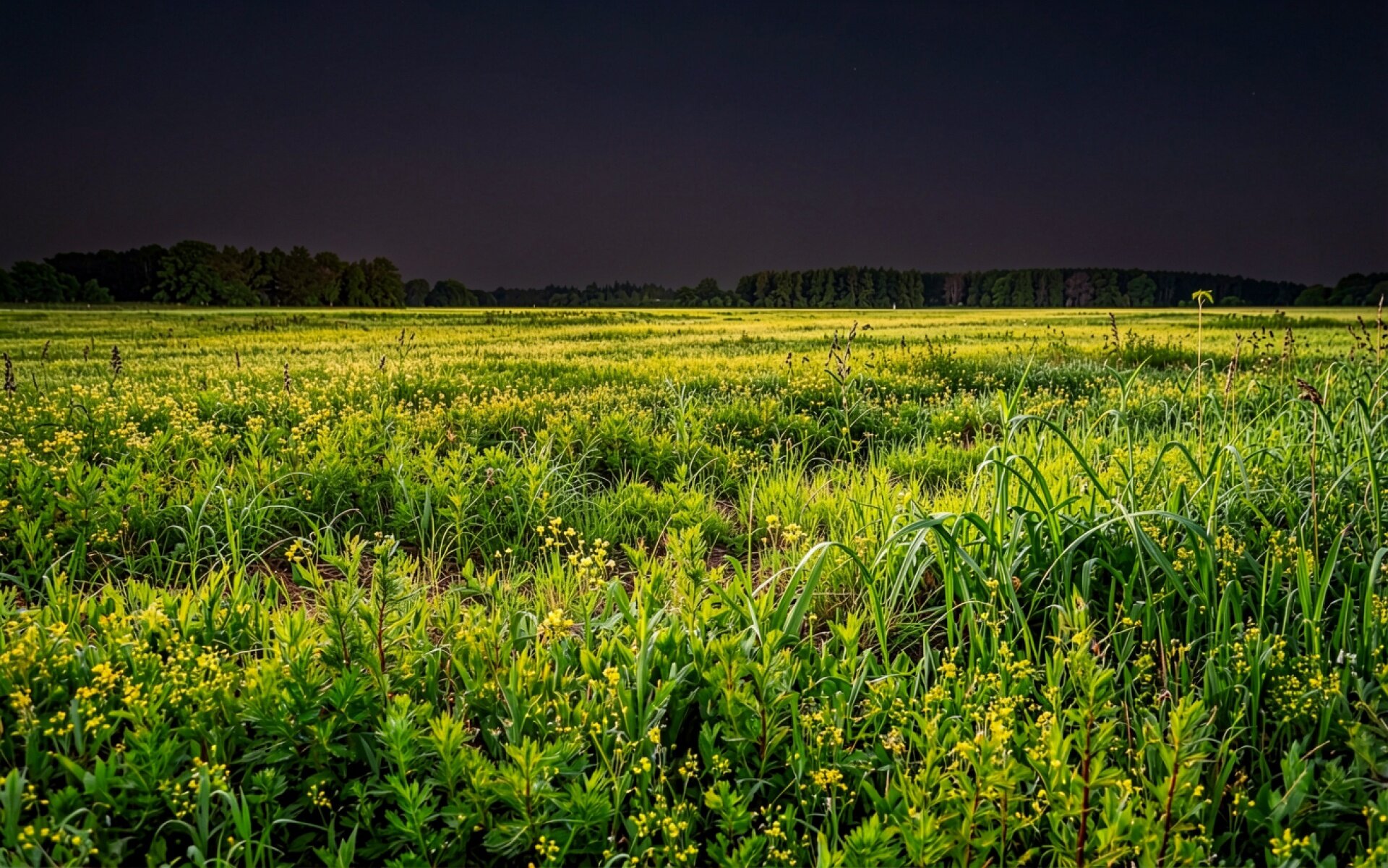 Ночной луг с желтыми цветами и лесом