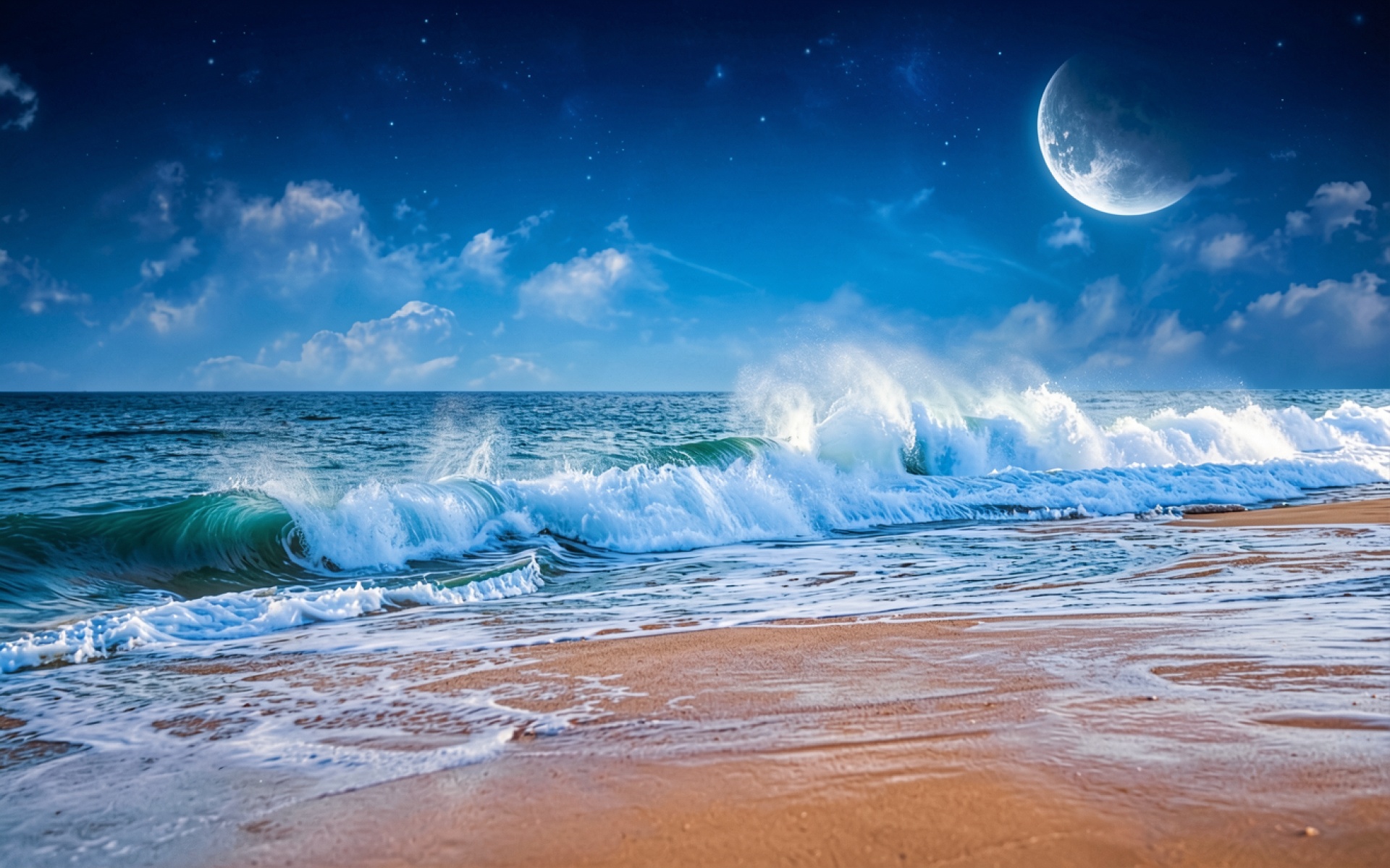 Ночной пляж с большой луной и волнами