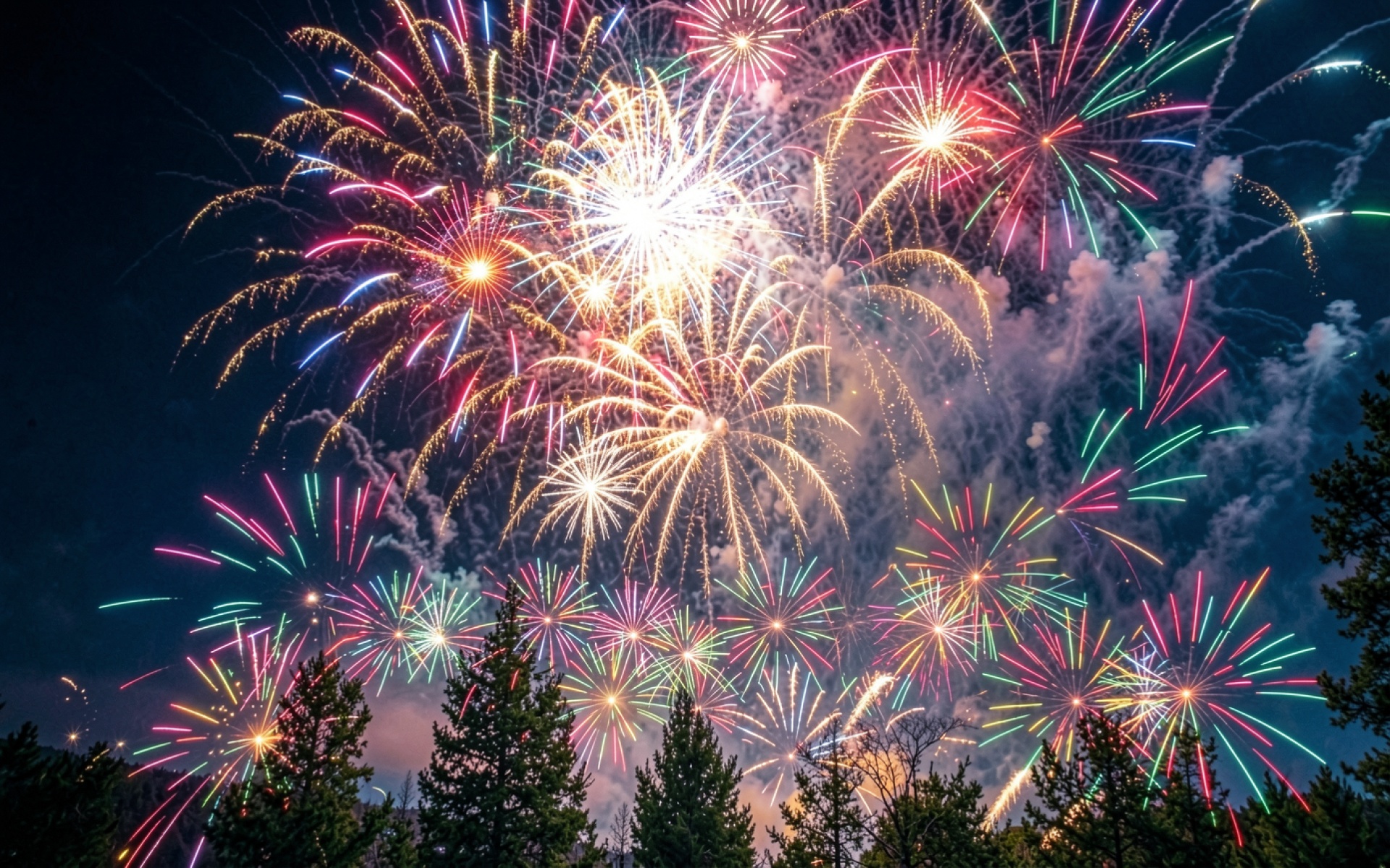 Разноцветные фейерверки в ночном небе над лесом
