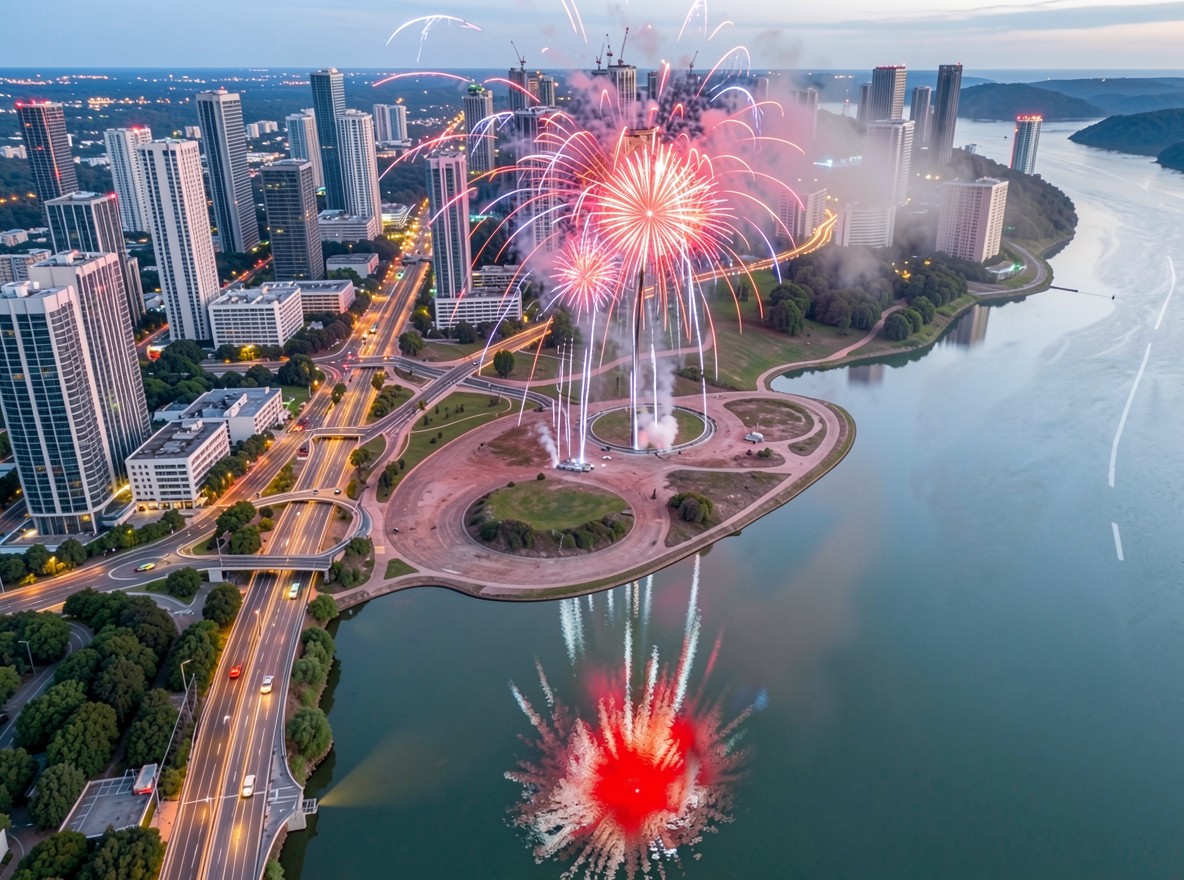 Яркий салют над ночным городом у реки