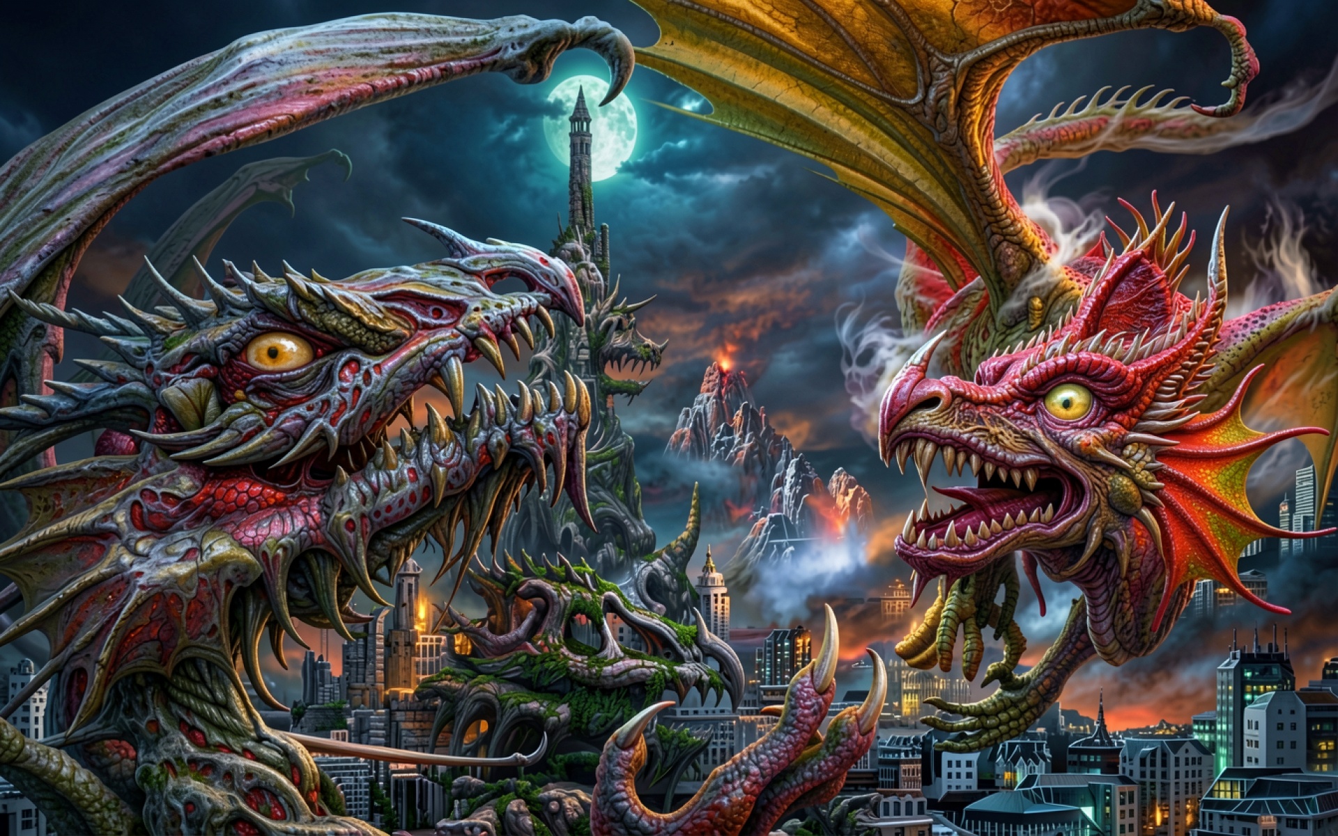 Битва двух красных драконов над ночным городом