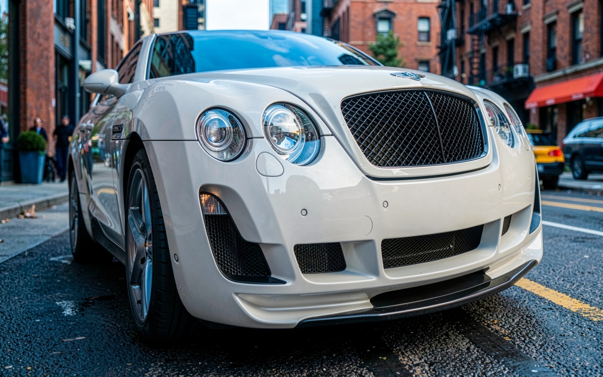 Белый автомобиль Bentley в городском интерьере Нью-Йорка