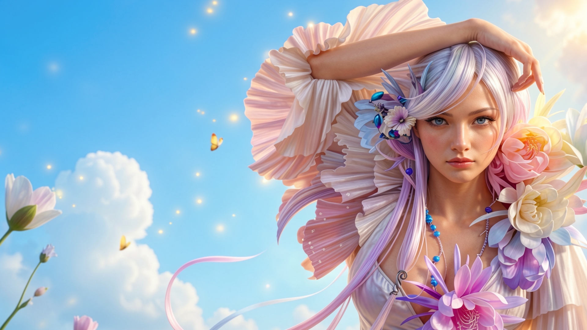 Девушка с фиолетовыми волосами в цветочных одеждах