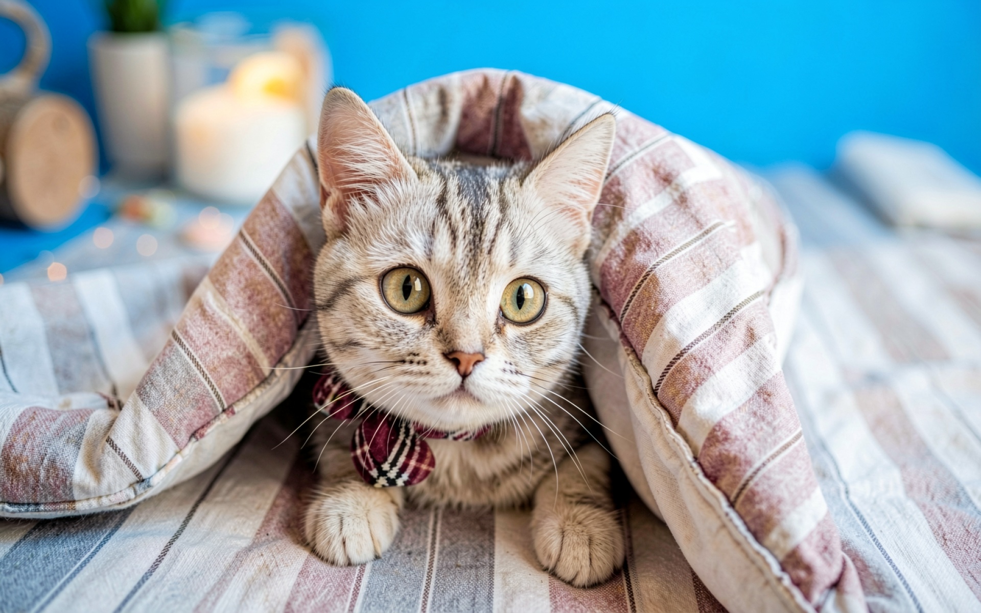 Полосатый кот в клетчатом одеяле синий фон