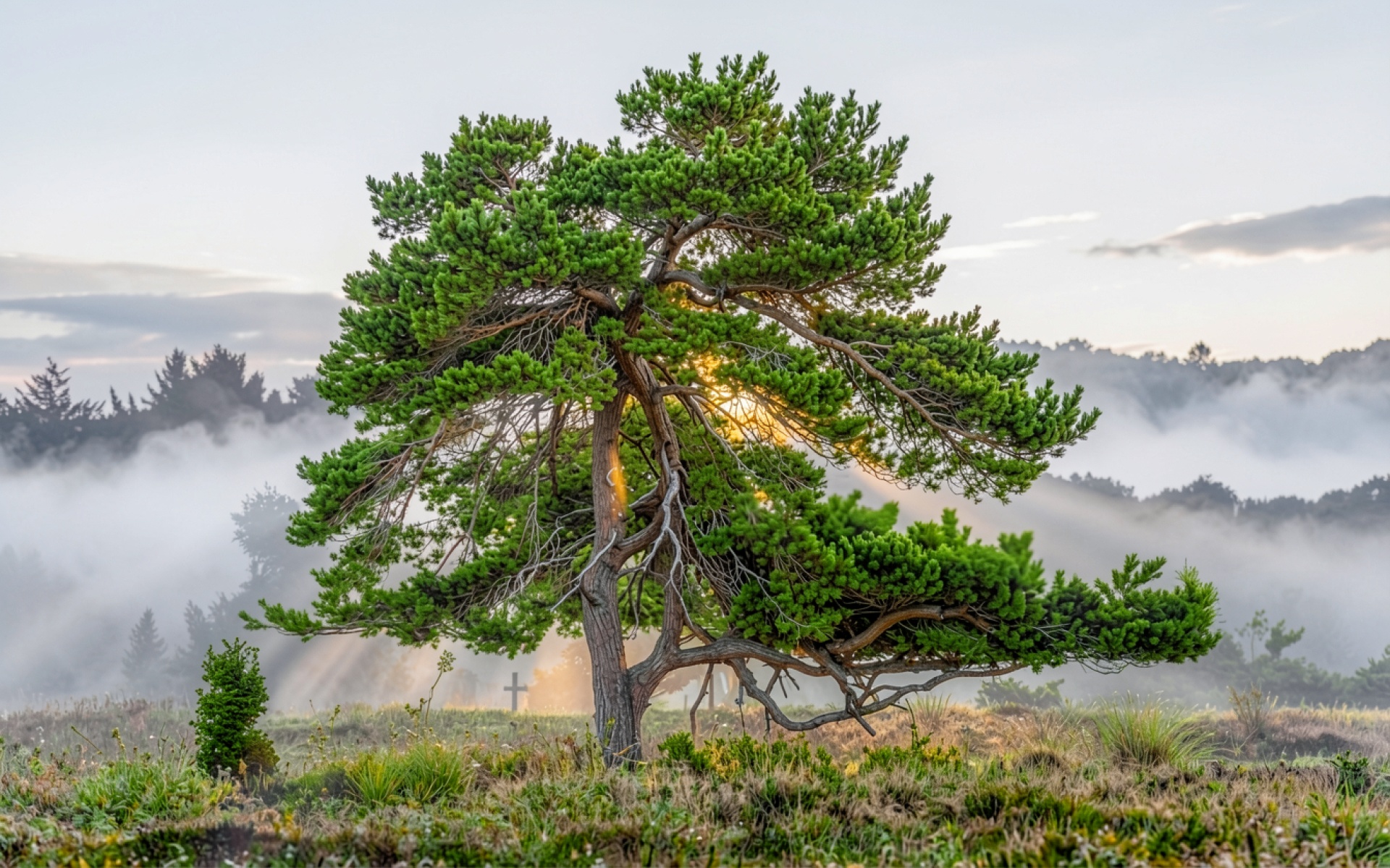 Одинокая сосна в туманном горном пейзаже