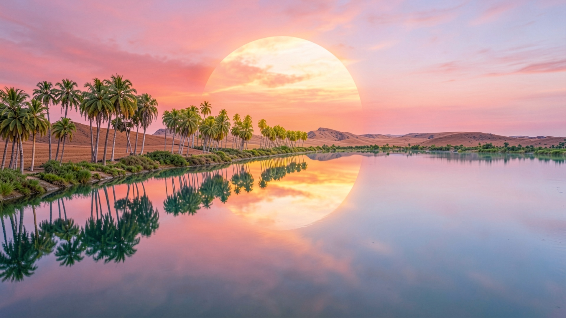 Тропические пальмы у озера в розовом закате