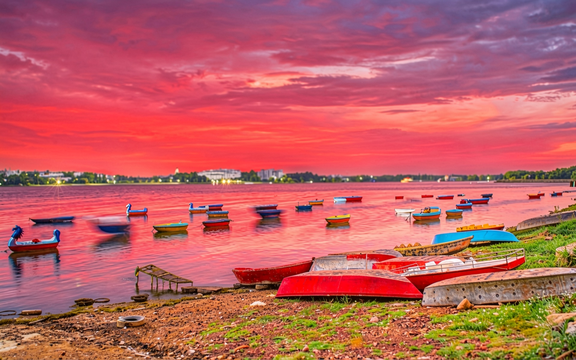 Разноцветные лодки на берегу озера в закате