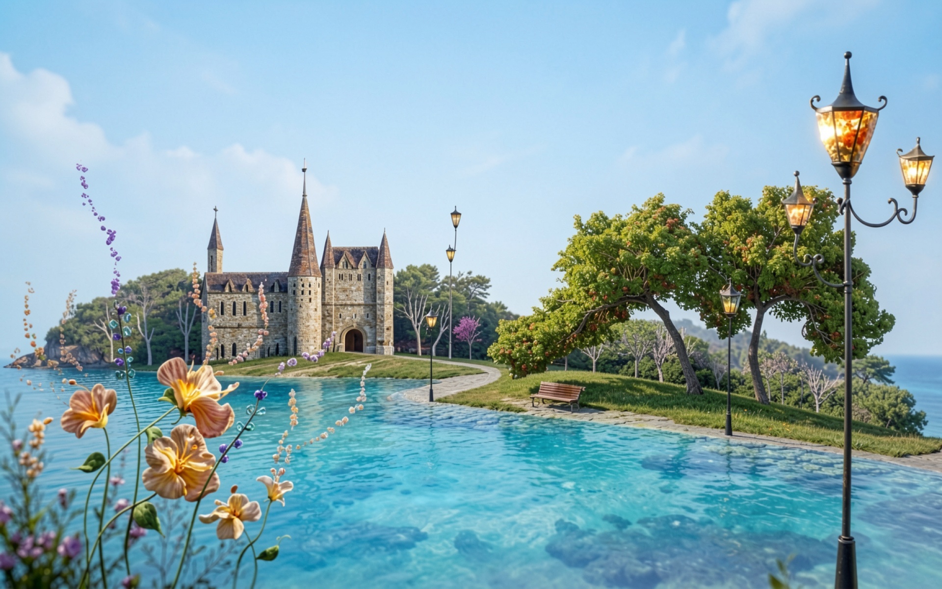 Средневековый замок у бирюзового озера с фонарями