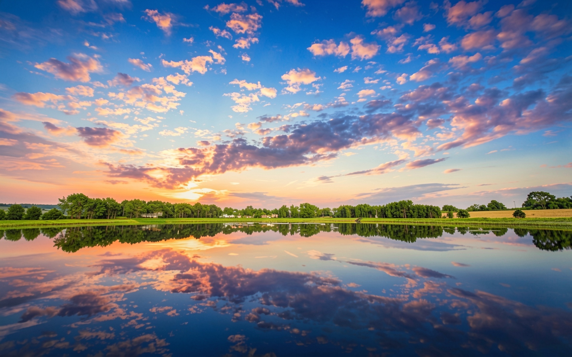 Озеро с отражением розовых облаков на закате