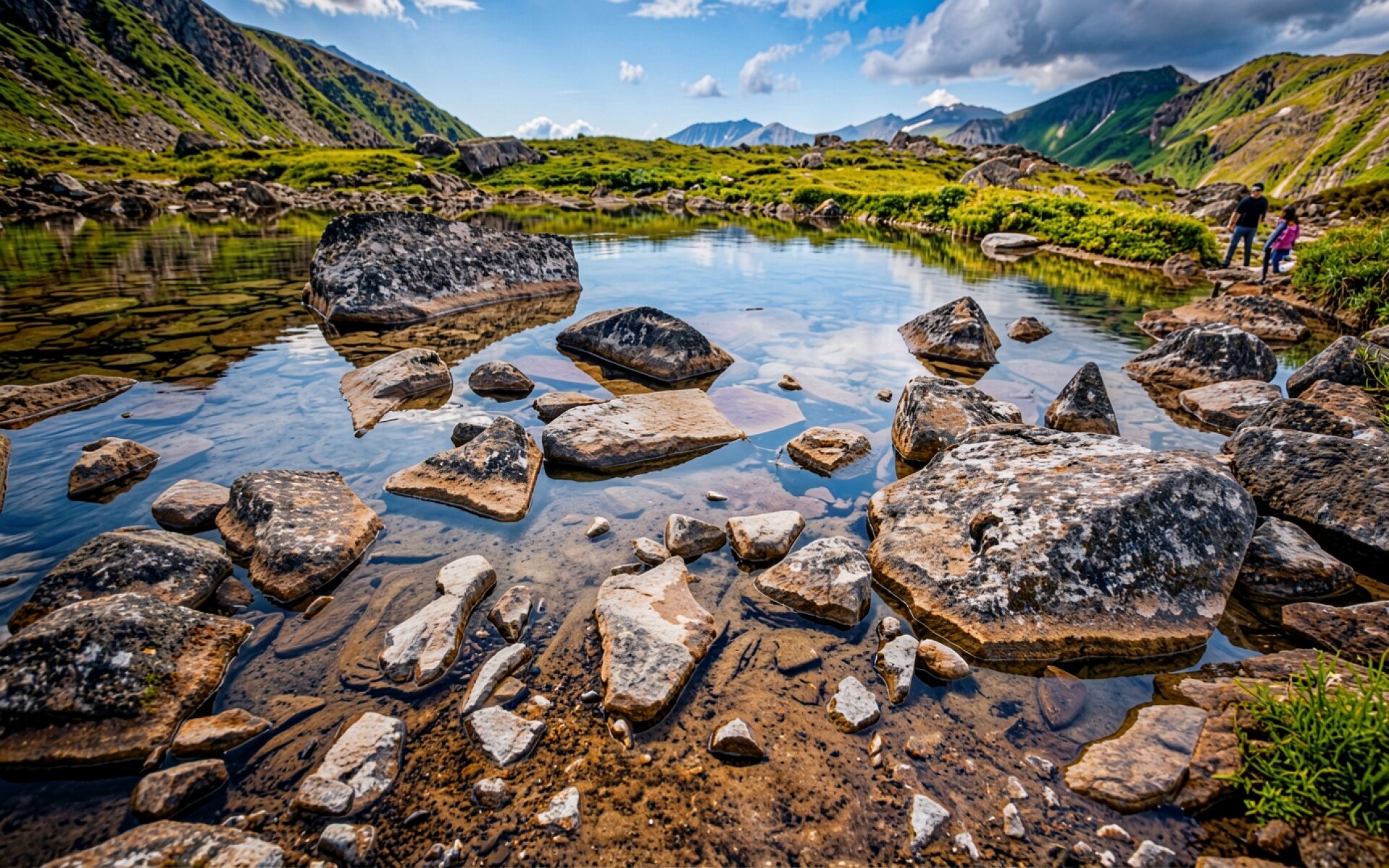 Горное озеро с камнями в солнечный день