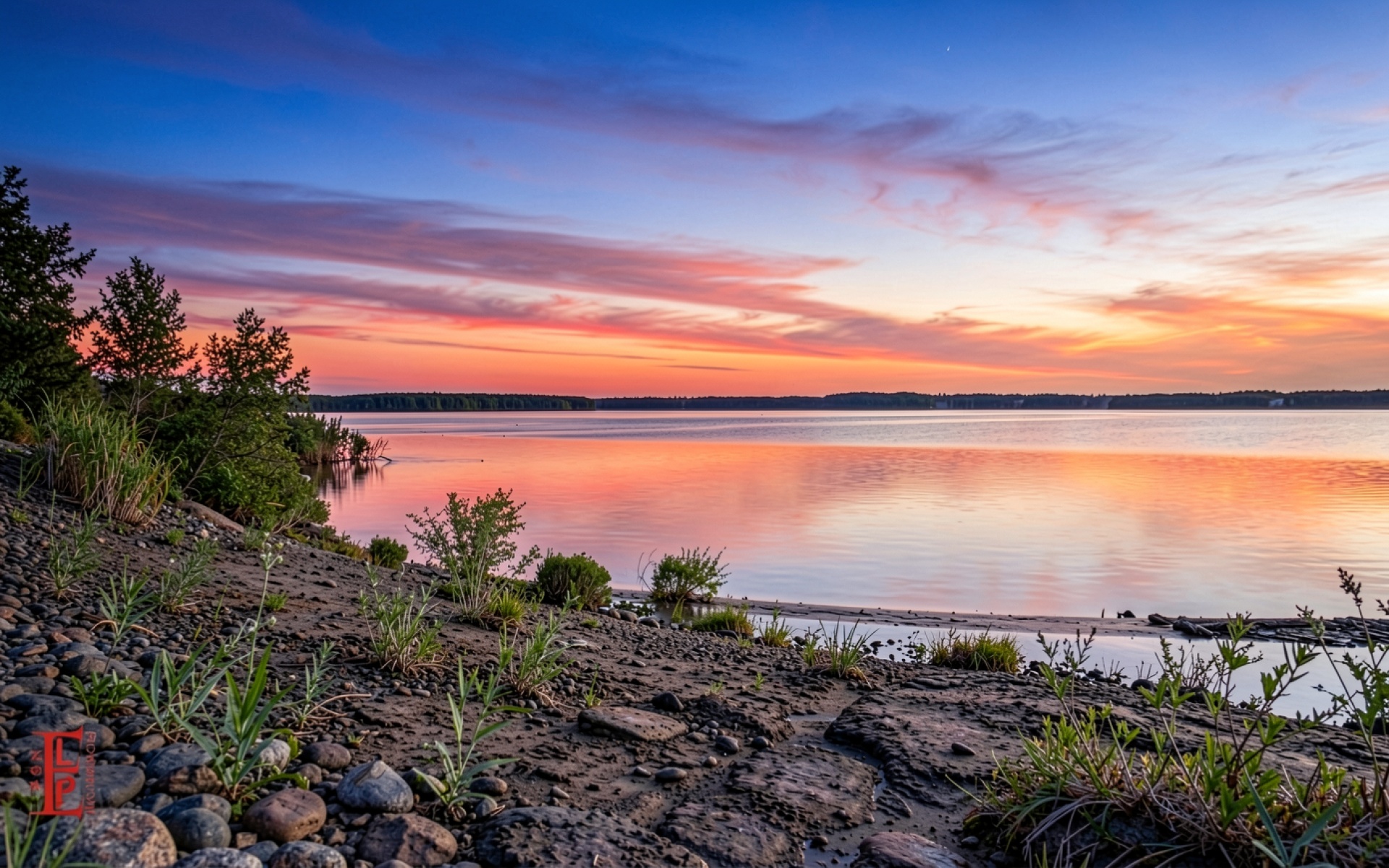 Закат над озером с каменистым берегом