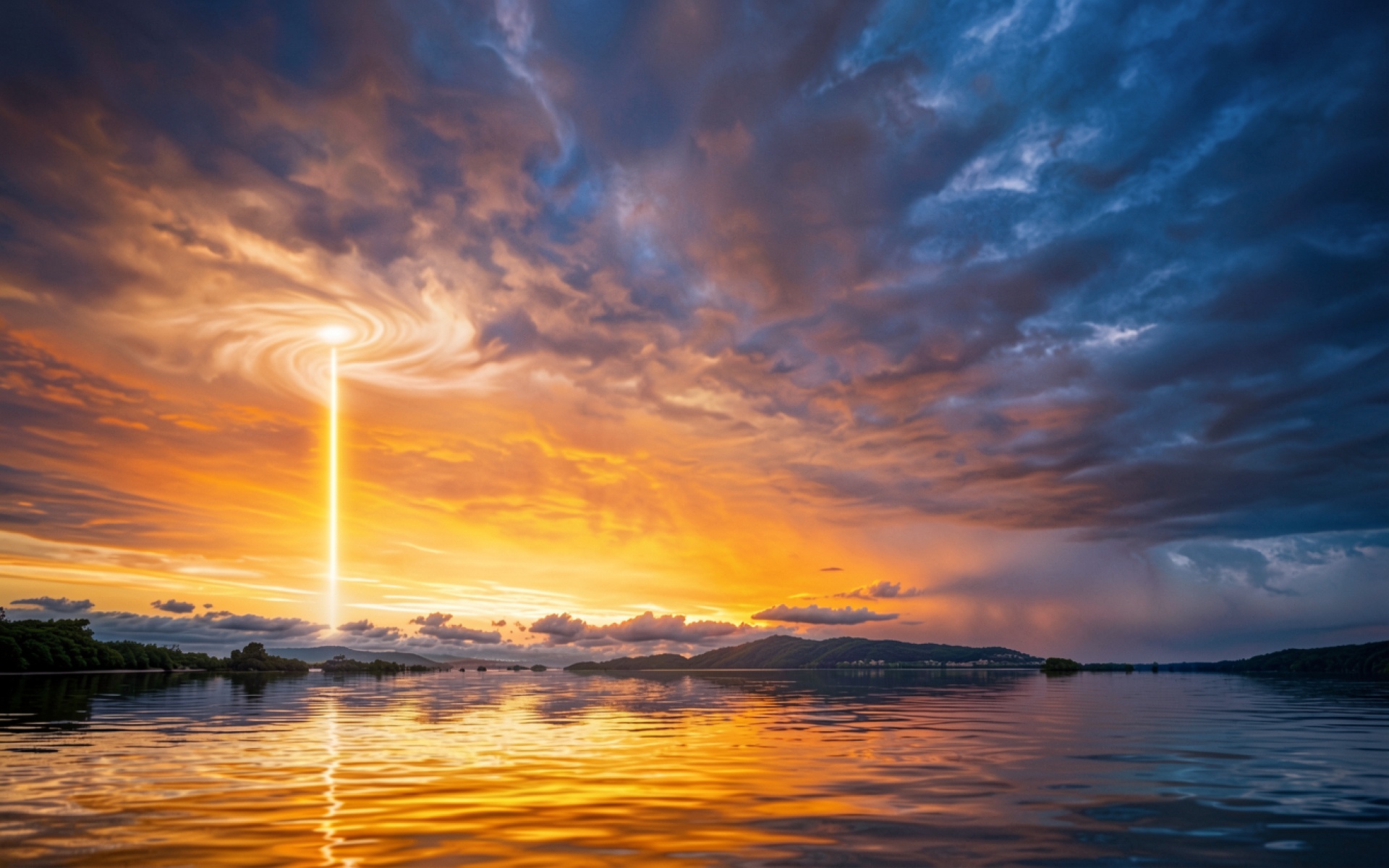 Золотой луч света в вечернем небе над озером