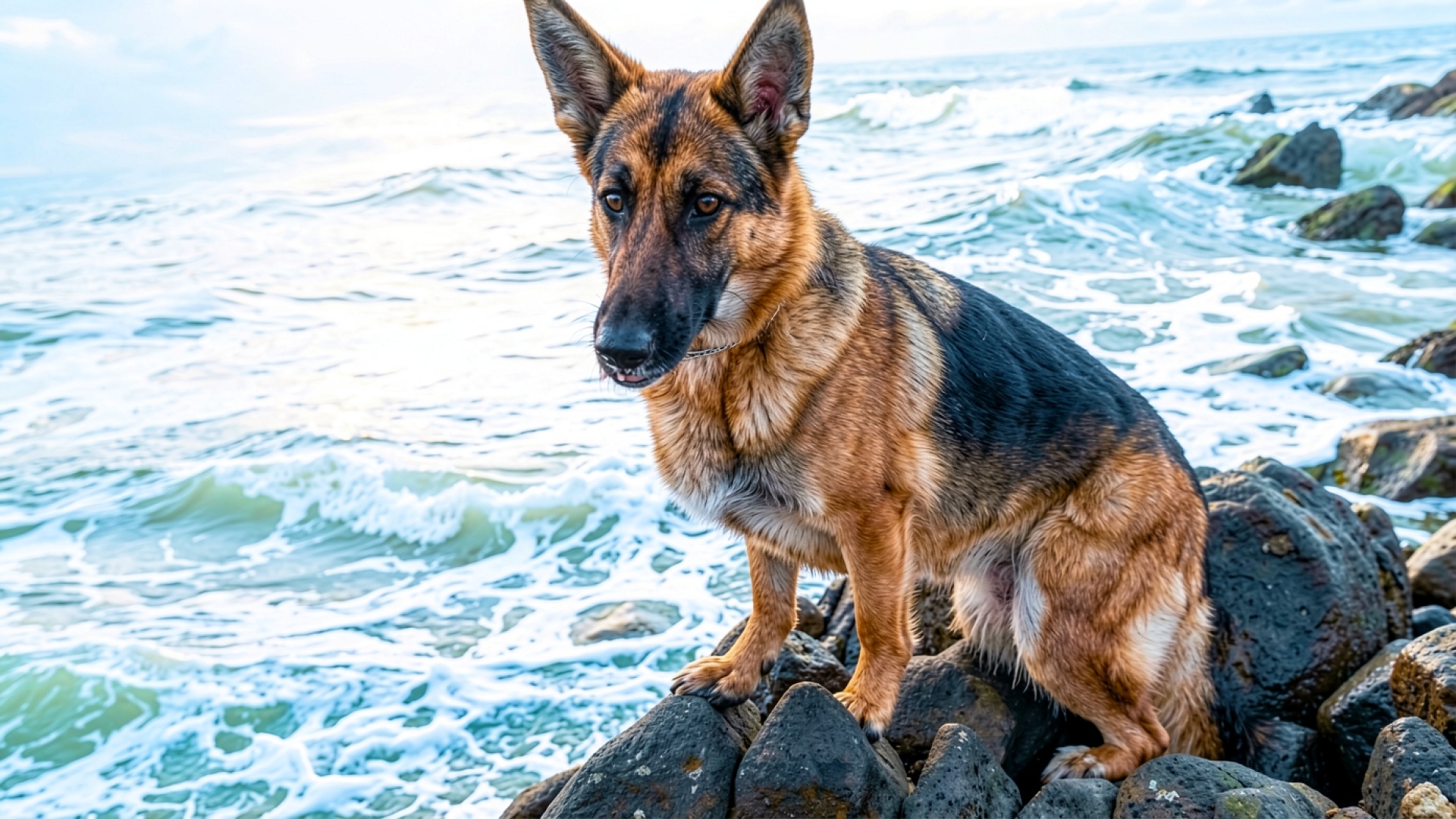 Немецкая овчарка на скалах у океана