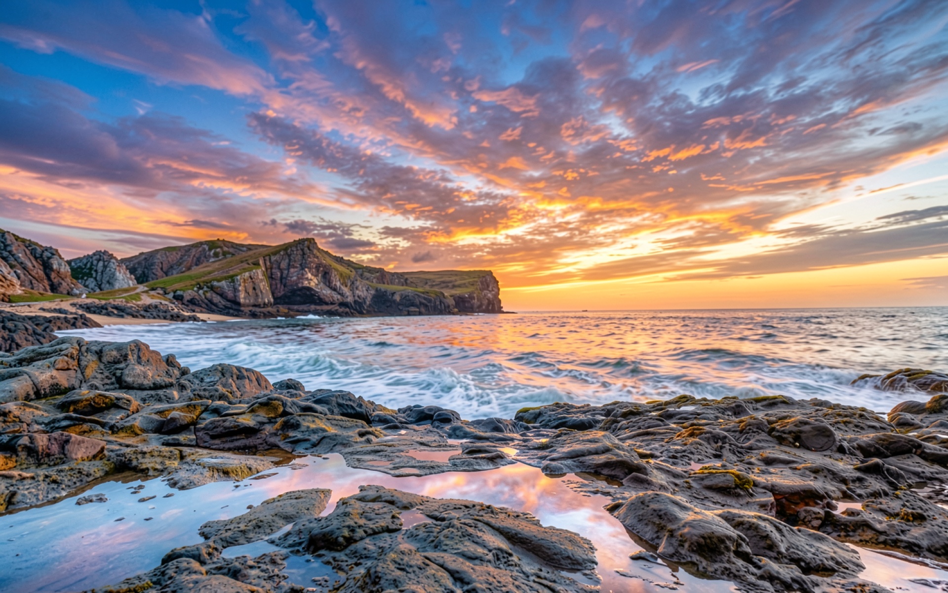 Закат над скалистым берегом океана в розовых тонах
