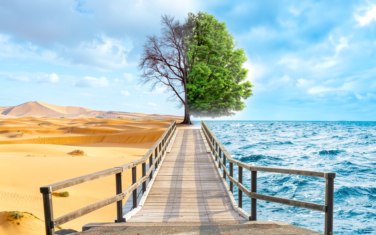 Сюрреалистичное дерево на мосту между пустыней и океаном