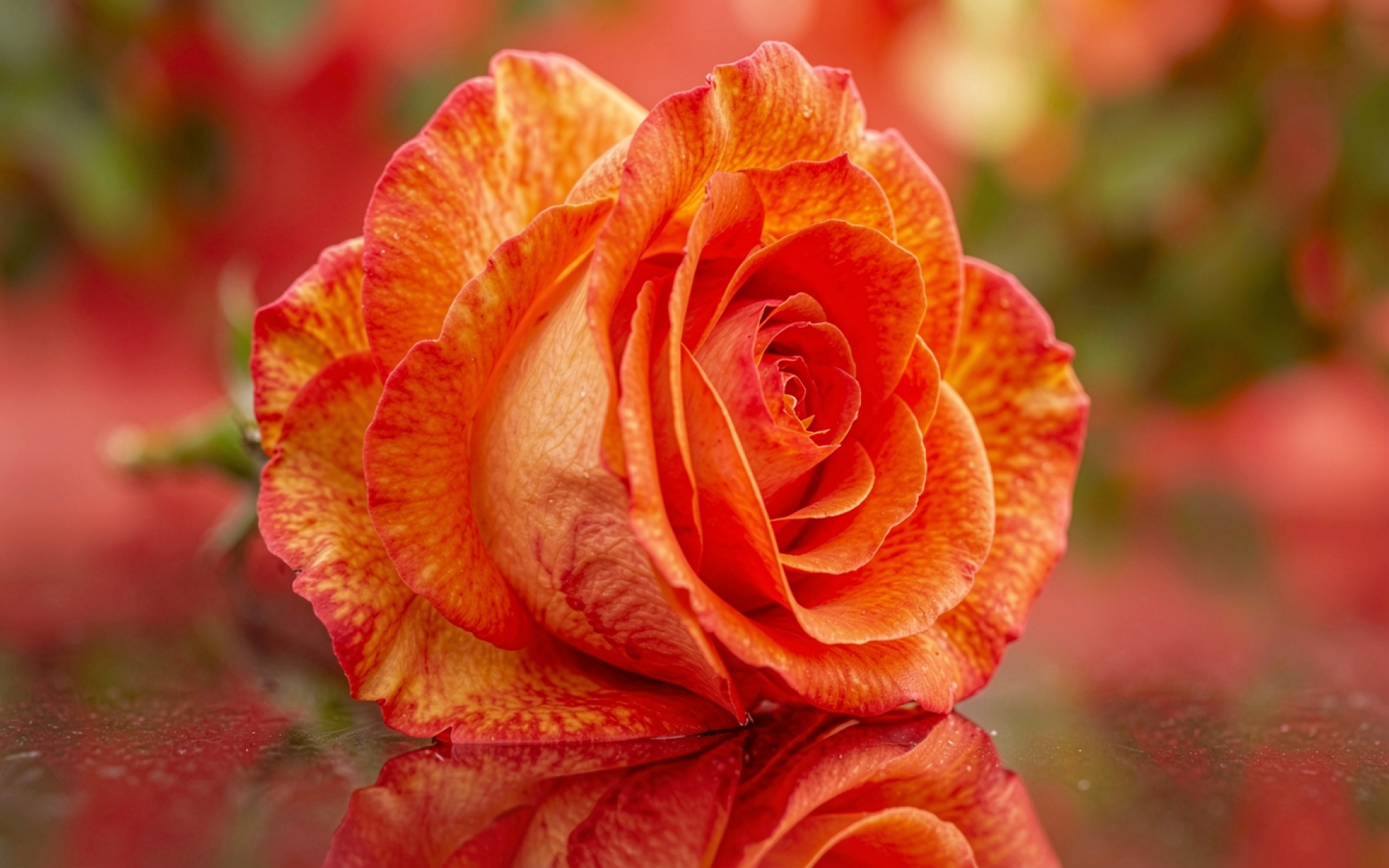 Оранжевая роза на зеркальной поверхности в саду