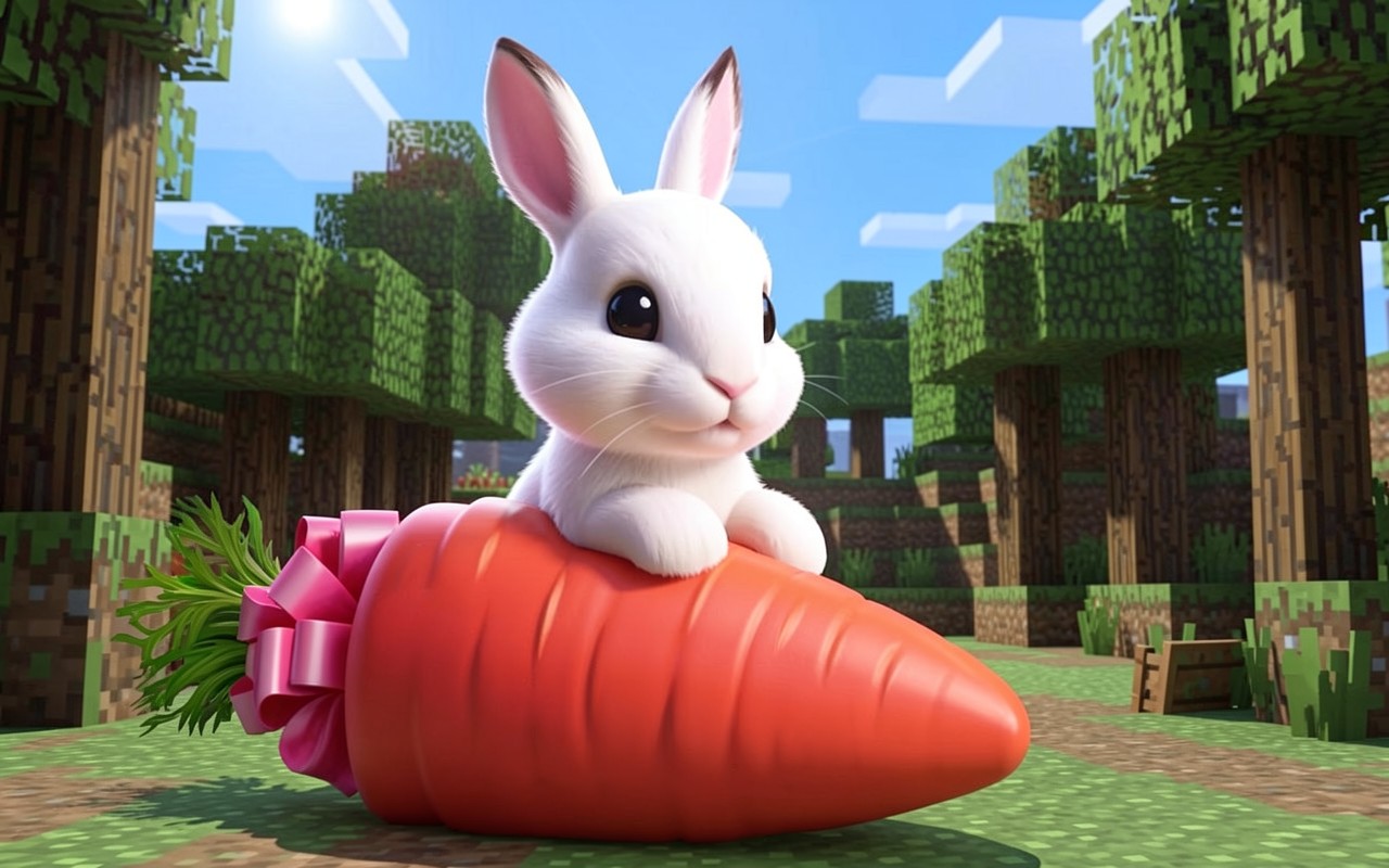 Белый кролик на большой оранжевой моркови