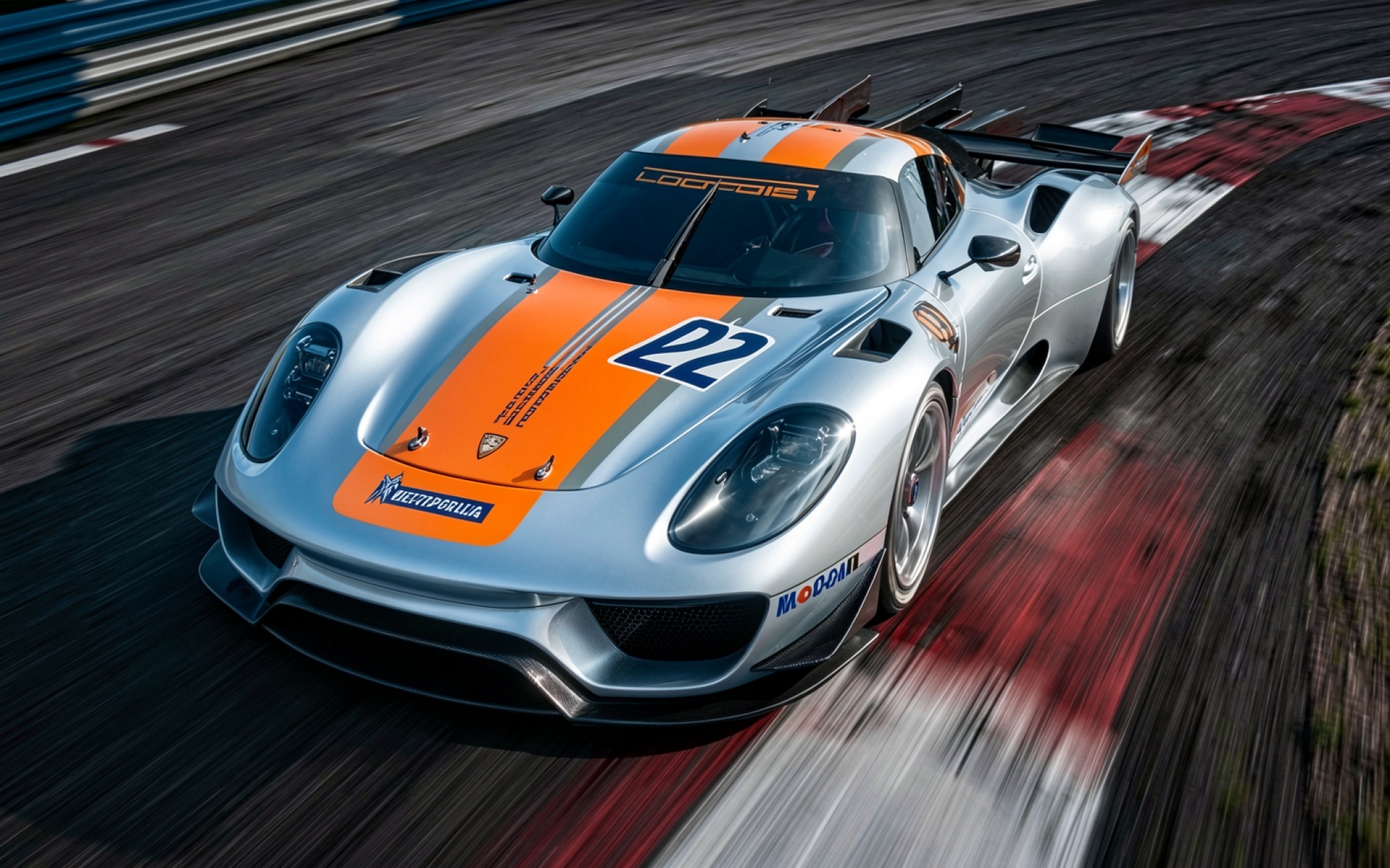 Гоночный автомобиль Porsche серебристый с оранжевой полосой