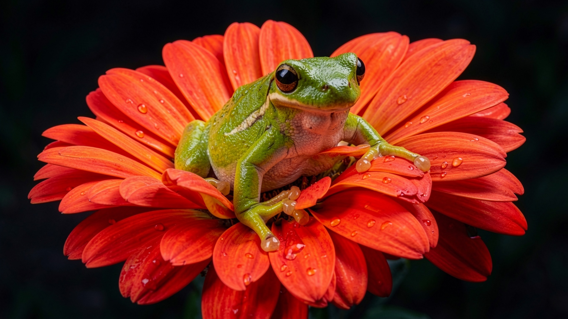 Зеленая древесная лягушка на оранжевом цветке