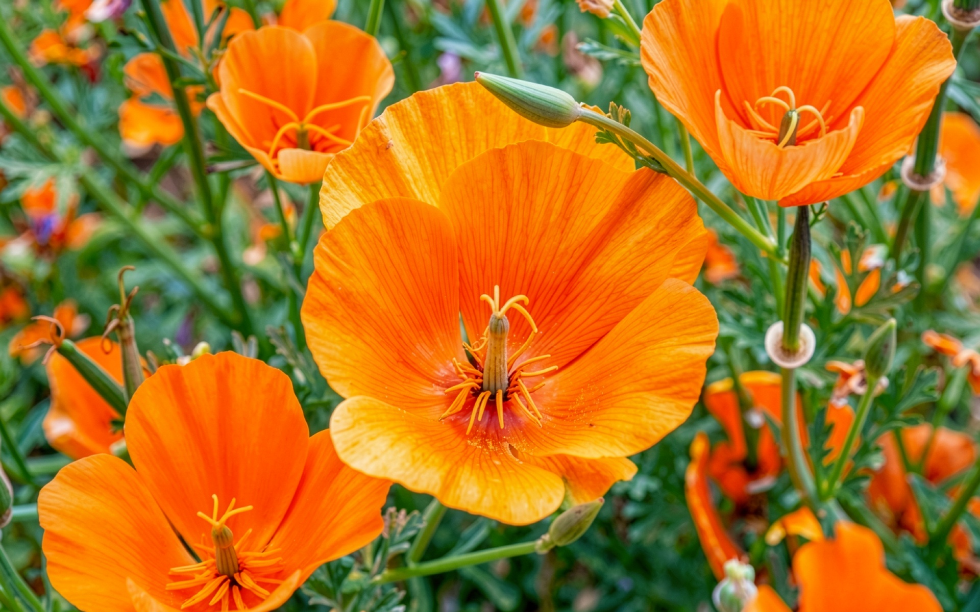 Оранжевые калифорнийские маки в зеленом саду