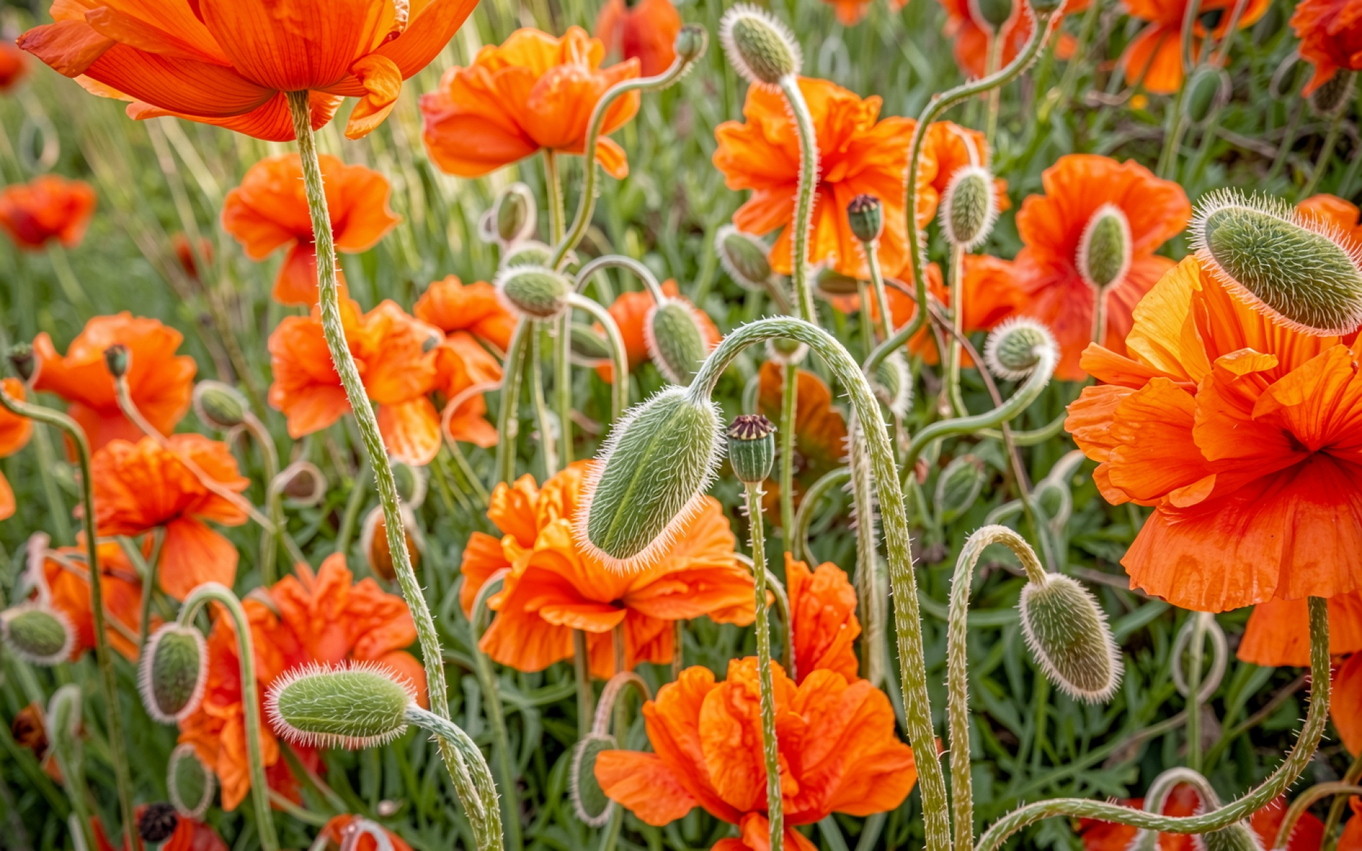 Оранжевые маки в зеленом поле при свете