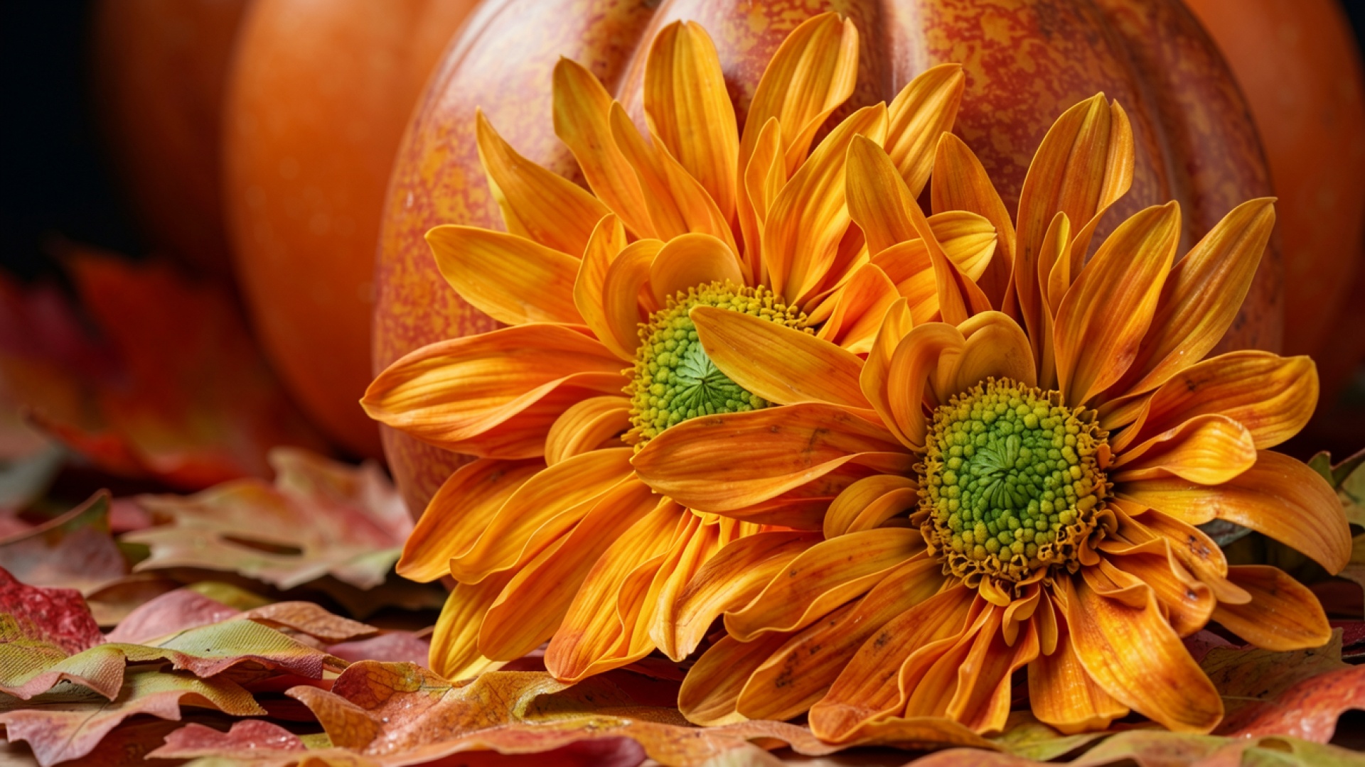 Оранжевые хризантемы с тыквами на осенних листьях