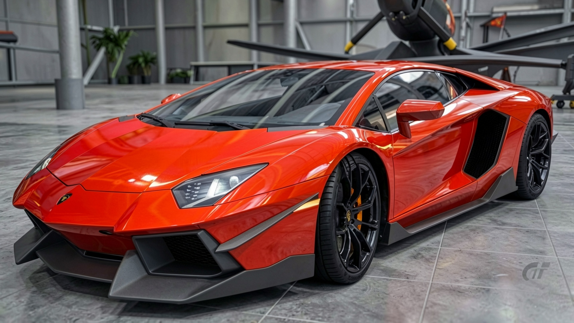 Оранжевый суперкар Lamborghini в современном бетонном ангаре