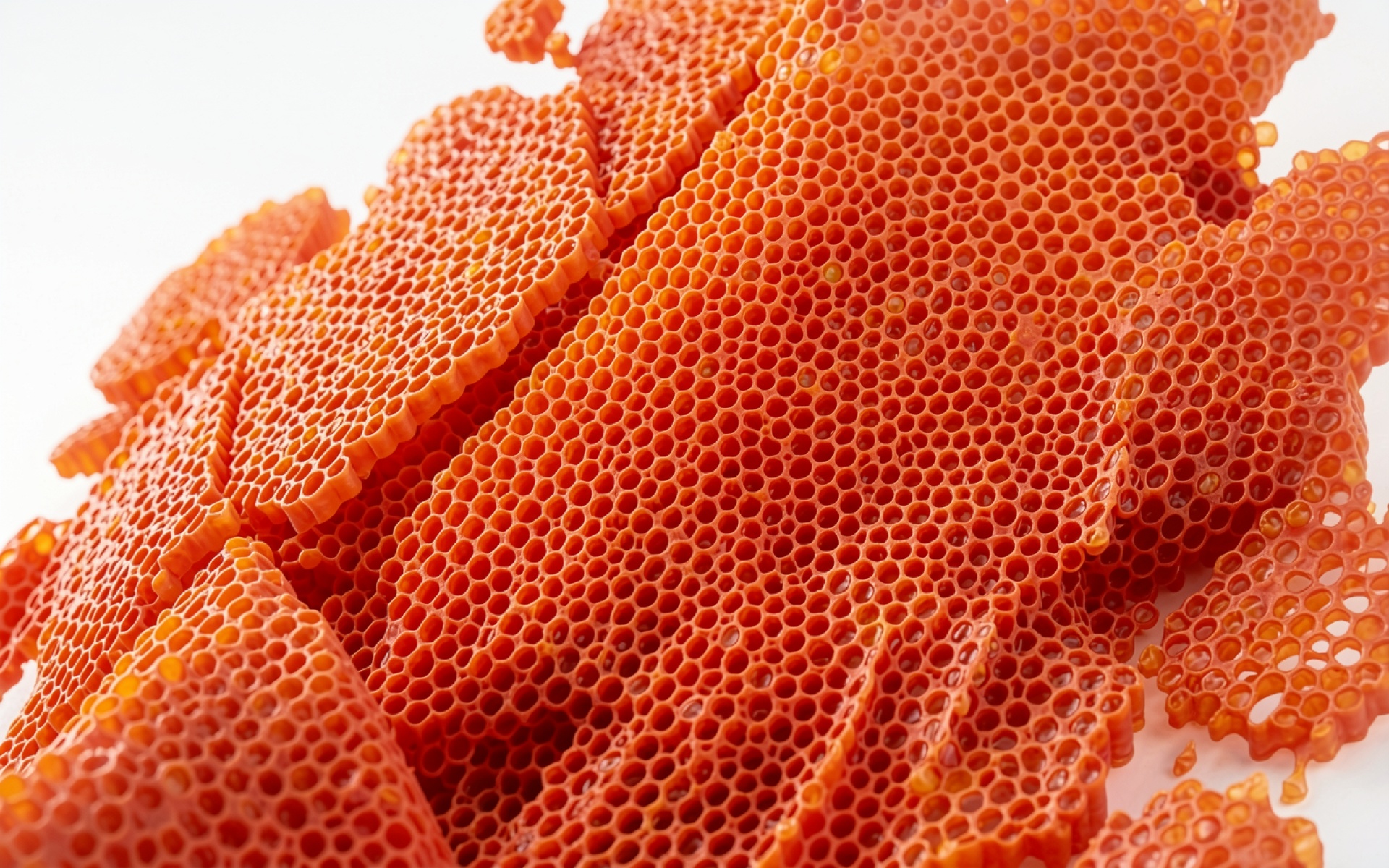 Осколки оранжевых пчелиных сот на белом фоне