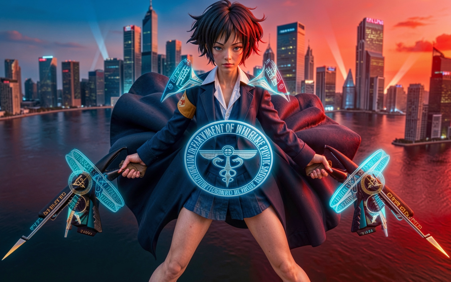 Киберпанк девушка с неоновым оружием в городе