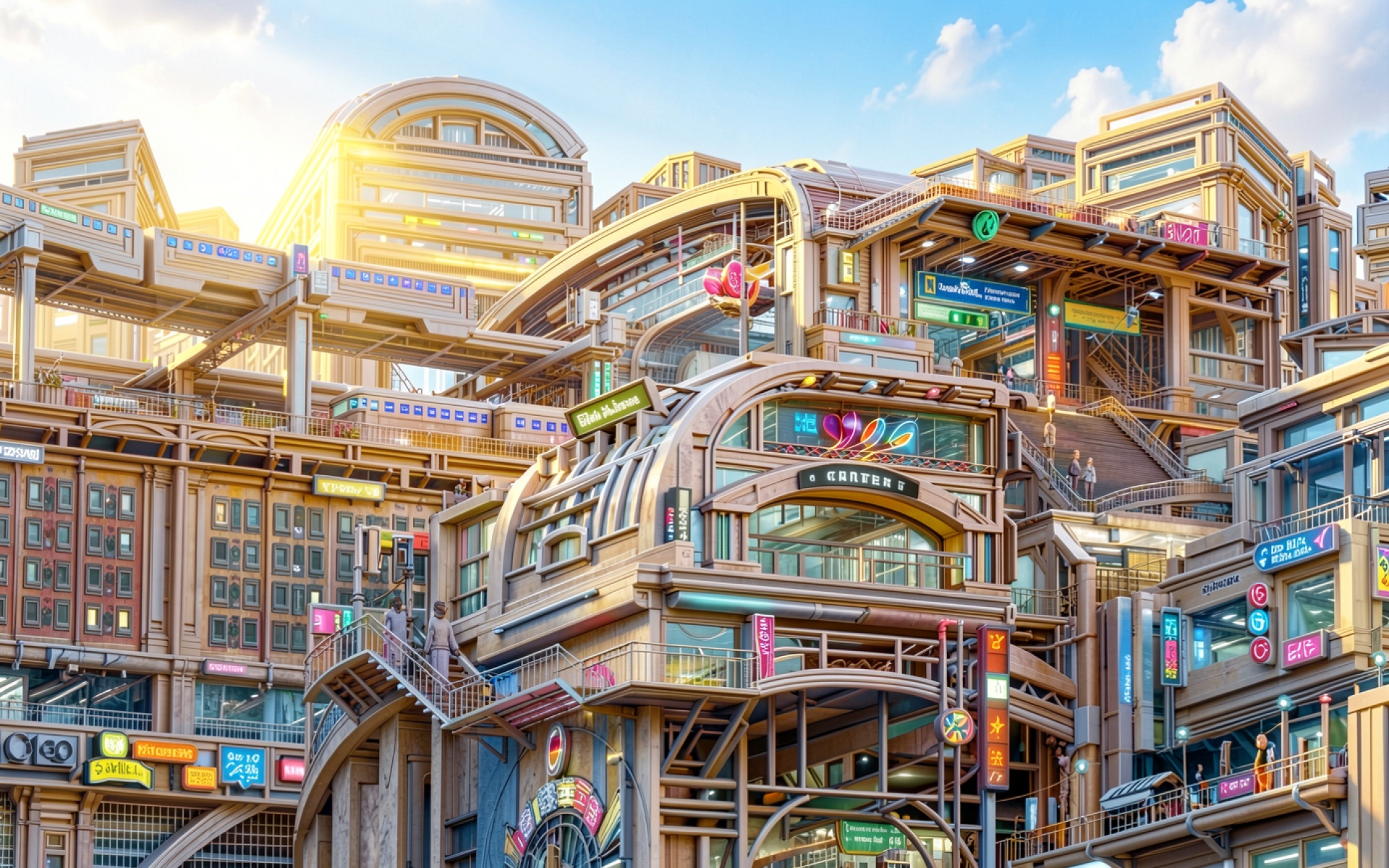 Футуристический город с золотистым освещением в стиле киберпанк